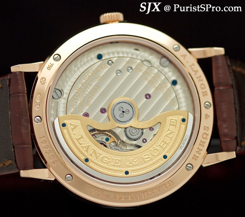Slightly larger is the Saxonia Automatik at 38.5 mm. Though at first glance this is reminiscent of the Lange Daymatic movement because of the rotor, there are differences. As a lower priced watch the movement has a gold-plated centre section of the rotor with a platinum outer mass. And the movement is less elaborate in other ways like the lack of jewels in screwed gold chatons for instance. While still lavishly decorated by most standards, this is the most frugal looking Lange movement in my mind.