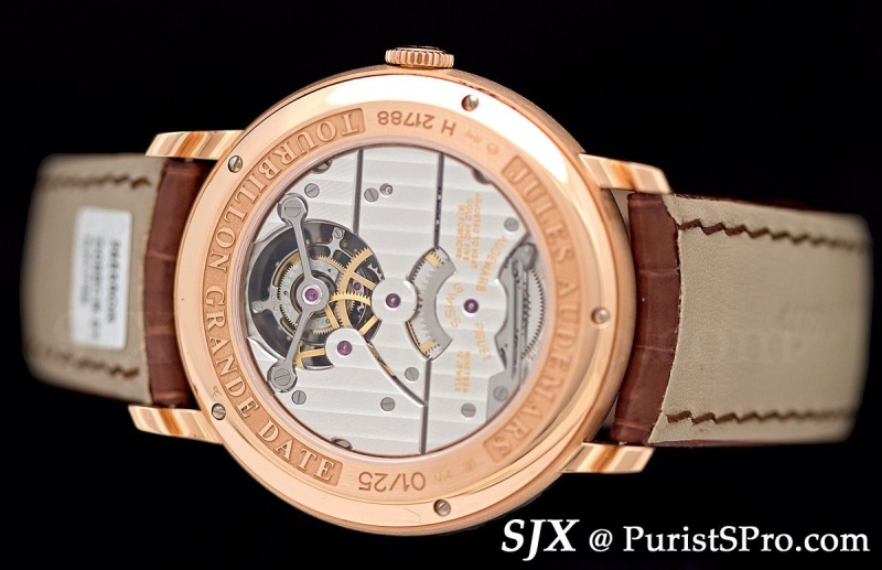 The DB25T is a tourbillon with dead seconds. This is a fusion of old and new, there are characteristics clearly inspired by vintage pocket watches (the chapter ring of the dial and the dead seconds), while the tourbillon is De Bethune’s 36,000 bph high-beat tourbillon with silicon cage and escape wheel. The jumping seconds mechanism is under a titanium bridge with a gold escape wheel. This is truly a beautifully executed timepiece.