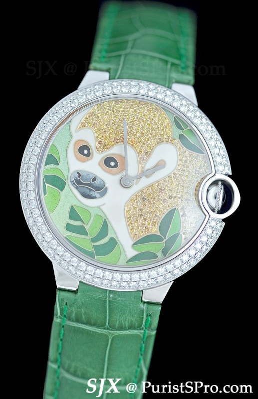 This Ballon Bleu with monkey motif is decorated with champlevé grand feu and set with diamonds.