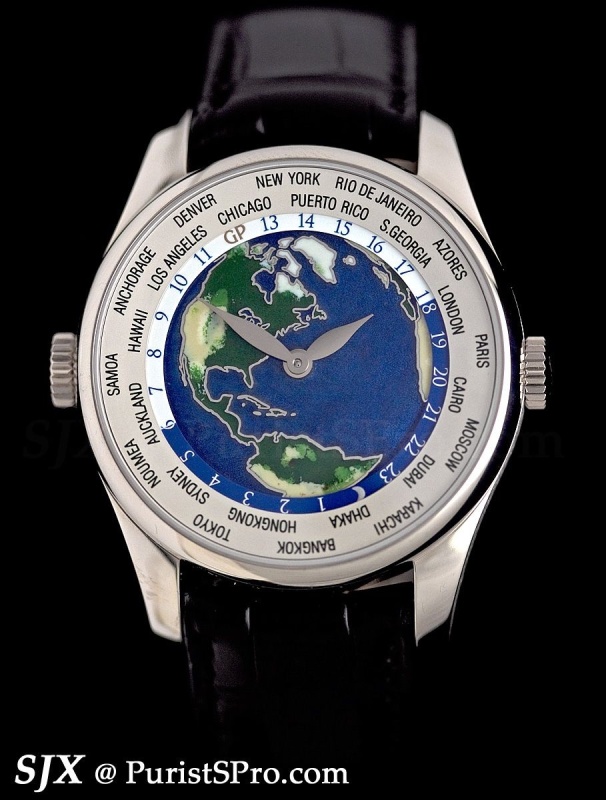 And saving the most interesting for last: the ww.tc is now available with a champlevé enamel dial, but turn it over and you see the Three Gold Bridges tourbillon. Notably, GP makes its enamel dials in-house. These will be made to order with any continent specified by the client.