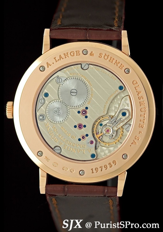 The slimmest of the additions is Saxonia Thin, available only in rose gold. At 40 mm and 5.9 mm high, its dimensions are not what one usually associates with Lange. The movement has exposed barrel ratchet and transmission wheel for slimness.