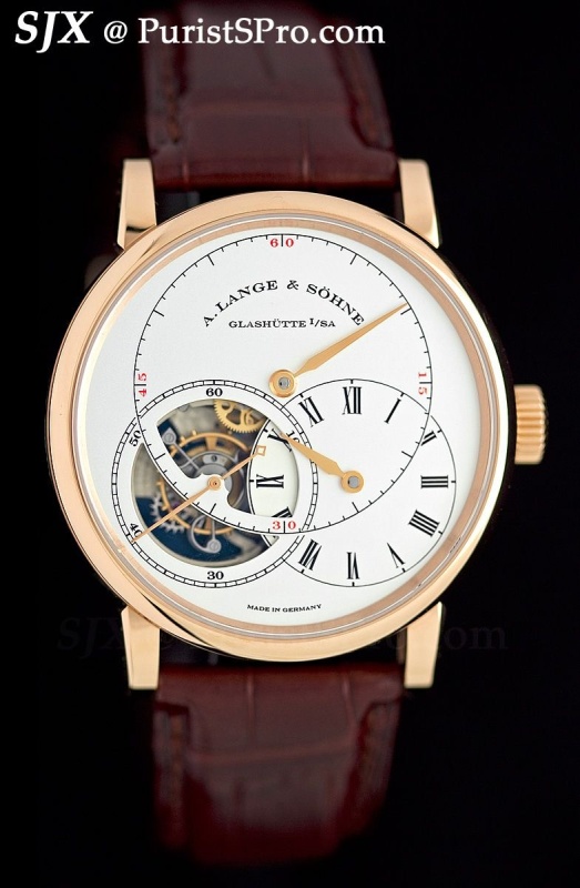Based on a vintage regulator pocket watch, this watch combines two developments from past Lange tourbillon watches: the chain-and-fusee and the hack seconds tourbillon. In addition it has an hours disc that jumps at six o’clock to bridge the hour track from eight to ten, before jumping back at 12 o’clock. This gives an unimpeded view of the tourbillon from 12 to six.
