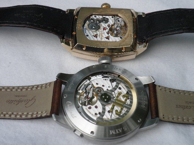 First, I have seen several detailed photos of the Cal.100 and I have noticed that in some movements, there are several jewels with blue screwed gold chatons and then in other C.100 photos, it looks like that feature has been omitted. I know that gold chatons are primarily aesthetic anymore, but in my mind they are important to the movement and speak as much to it's Saxon heritage as swan neck regulators, "Glashutte striping" and 3/4 plates. The watch I will get is the solid caseback version, but I will most certainly take at least one good look under the hood so I can wear the watch assured of exactly what's in there. Can anyone tell me whether I am mistaken, or are there some C.100 mov'ts out there with and some without the jewel chatons? Are there only certain references that get the "deluxe" C.100s?