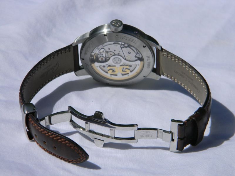 Second, I chose this watch over several others on a short list partly because of the two unique "complications" in this model. The panorama date, because it is another hallmark of Glashutte (v. Geneva) watchmaking at it's finest and regardless of it's exact placement on the dial, it is a large enough display for me to be able to read easily with my lousy close vision! In fact, I think the slightly asymmetrical placement of the date is a cue to the fact that this watch is meant to be functional first, aesthetics a secondary consideration. ....that's what I tell my self anyway, if you think that's a half-baked notion, than so be it!