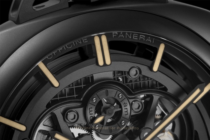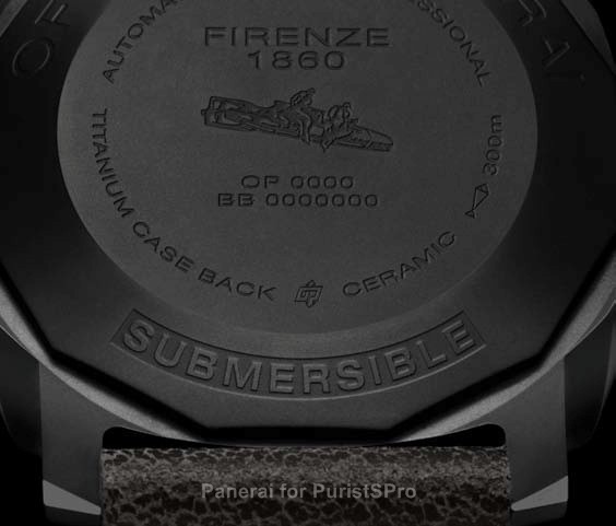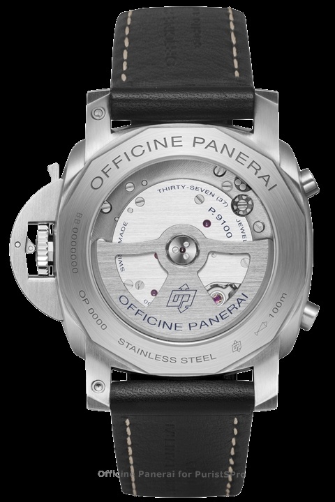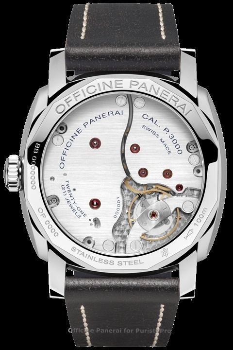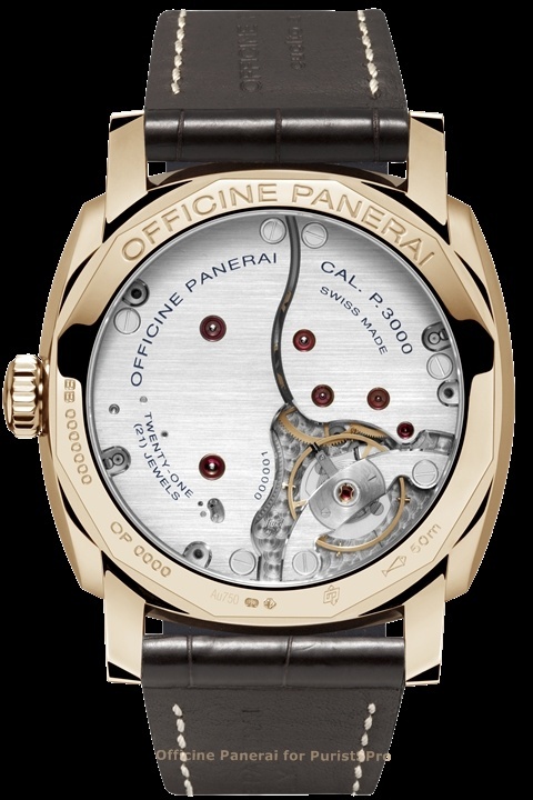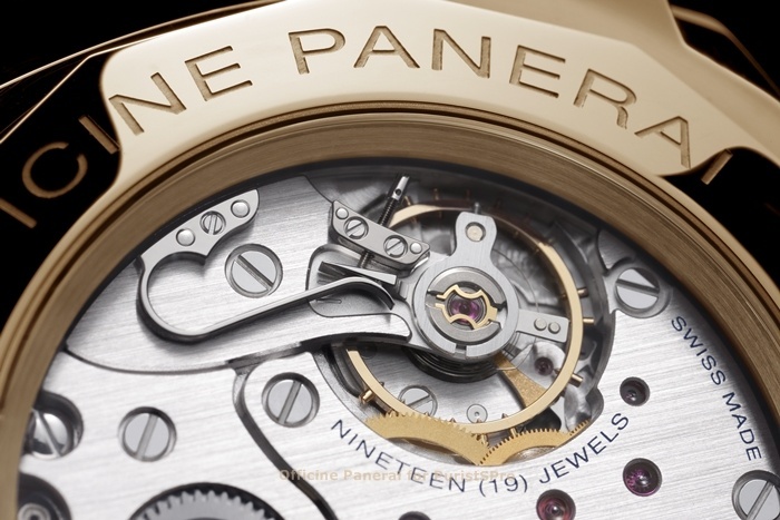Movement: Hand-wound mechanical, Panerai P.999/1 calibre, executed entirely by Panerai, 12 lignes, 3 mm thick, 19 jewels, Glucydur® balance, 21,600 alternations/hour. Incabloc® anti-shock device. Power reserve 60 hours. 144 components.