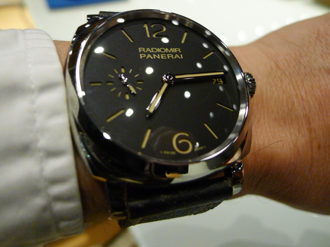 Dial: Black with luminous Arabic numerals and hour markers. Seconds at 9 o’clock.