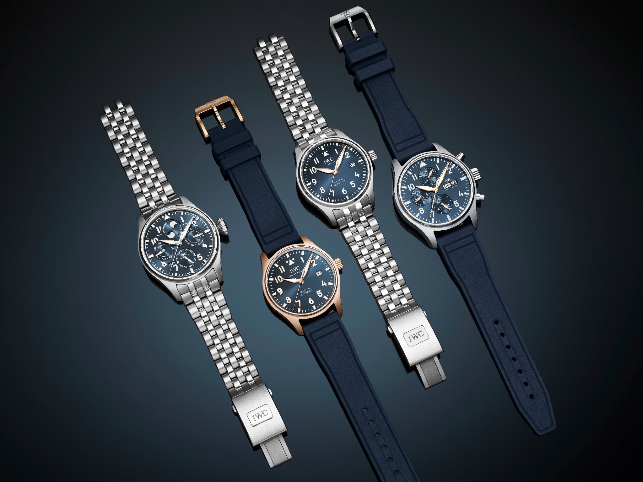 Pilot’s Watch Chronograph Le Petit Prince (Ref. IW378011): 43-millimetre stainless steel case, deep blue dial with a sunray finish, gold-plated hands with Super-LumiNova®, blue rubber strap with EasX-CHANGE® system, IWC-manufactured 69385 calibre.