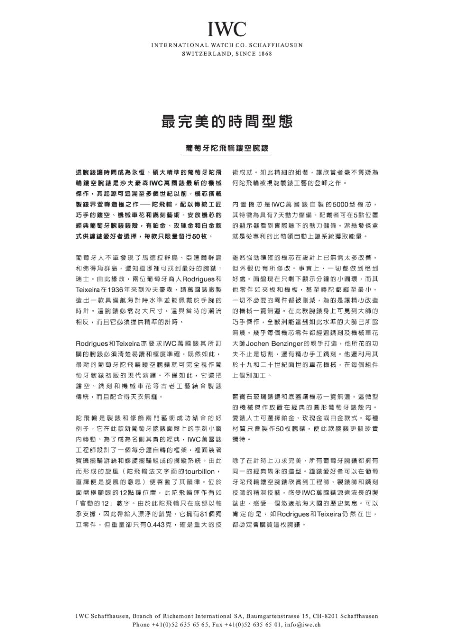 This watch preserves time. The new Portuguese Tourbillon Mystère Squelette from IWC Schaffhausen is a generously dimensioned, precision mechanical masterpiece, whose origins can be traced back to centuries past. The movement combines the pinnacle of watchmaking, the tourbillon, with the traditional craftsman’s arts of skeletonising, engine-turning and engraving. It is housed in a classic Portuguese case. Watch lovers have the choice between platinum, rose gold and white gold, in each of which only 50 examples of this exclusive watch will be manufactured.