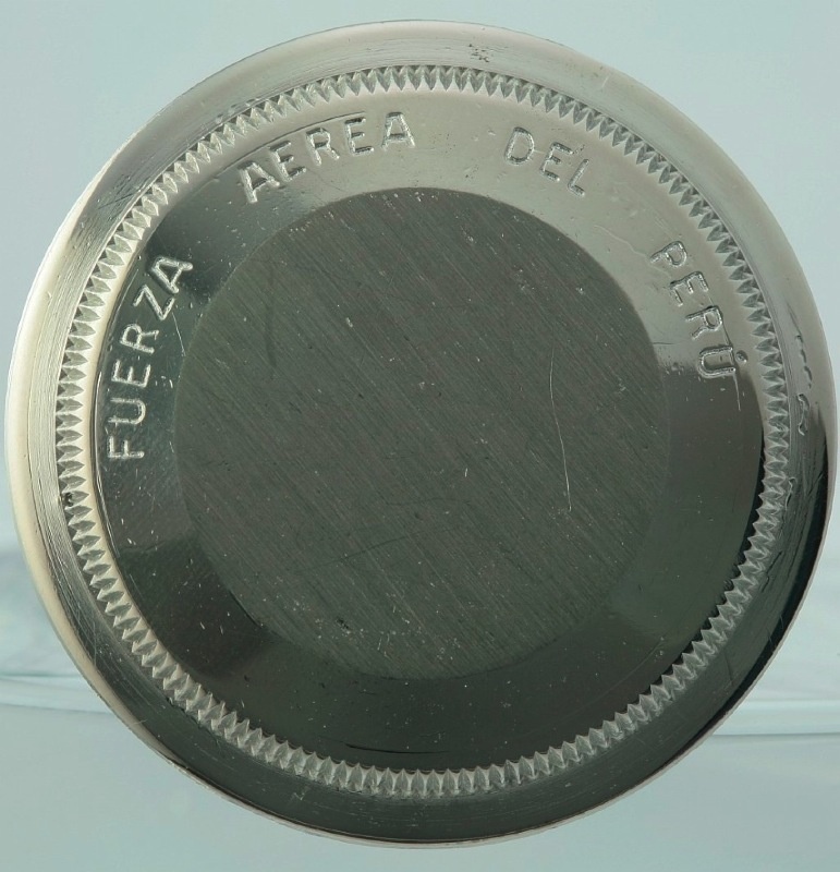 The back of the watches bear the inscription “Fuerza Aerea del Perú” in a Roman sans-serif face, and filled with black enamel. In many cases, this black filling has disappeared over time, leaving only the engraved portion visible, or even polished and rubbed away. An additional engraving is present on the outside of the case-back, a unique military identifier, or ‘issue number’, and would correspond to the records kept by the Air-Force. The engraving of this number is very thin and it has disappeared with time in most cases.
