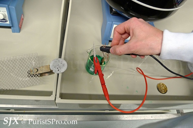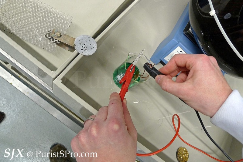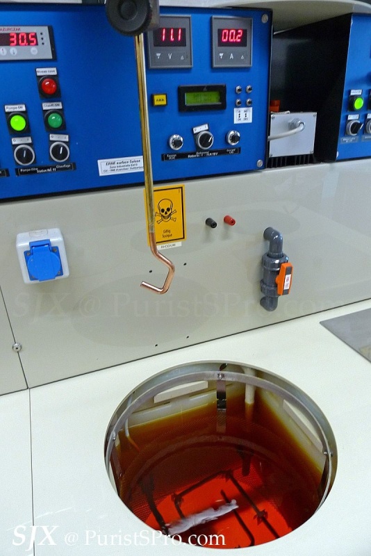 Above: Parts are hung on this and immersed in the dangerous looking electrolyte solutions shown below