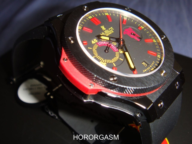the watch is a limited edition 500 piece affair, featuring the HUB45 caliber, a black satin polished ceramic case and bezel with H-titanium screws. the bezel lugs are made from red composite resins. other attractive features include the Man-U logo and i love the yellow luminescent hands. unique feature is also a 45 min counter, reflecting each half times taken for a soccer match(ignoring extra time!!)