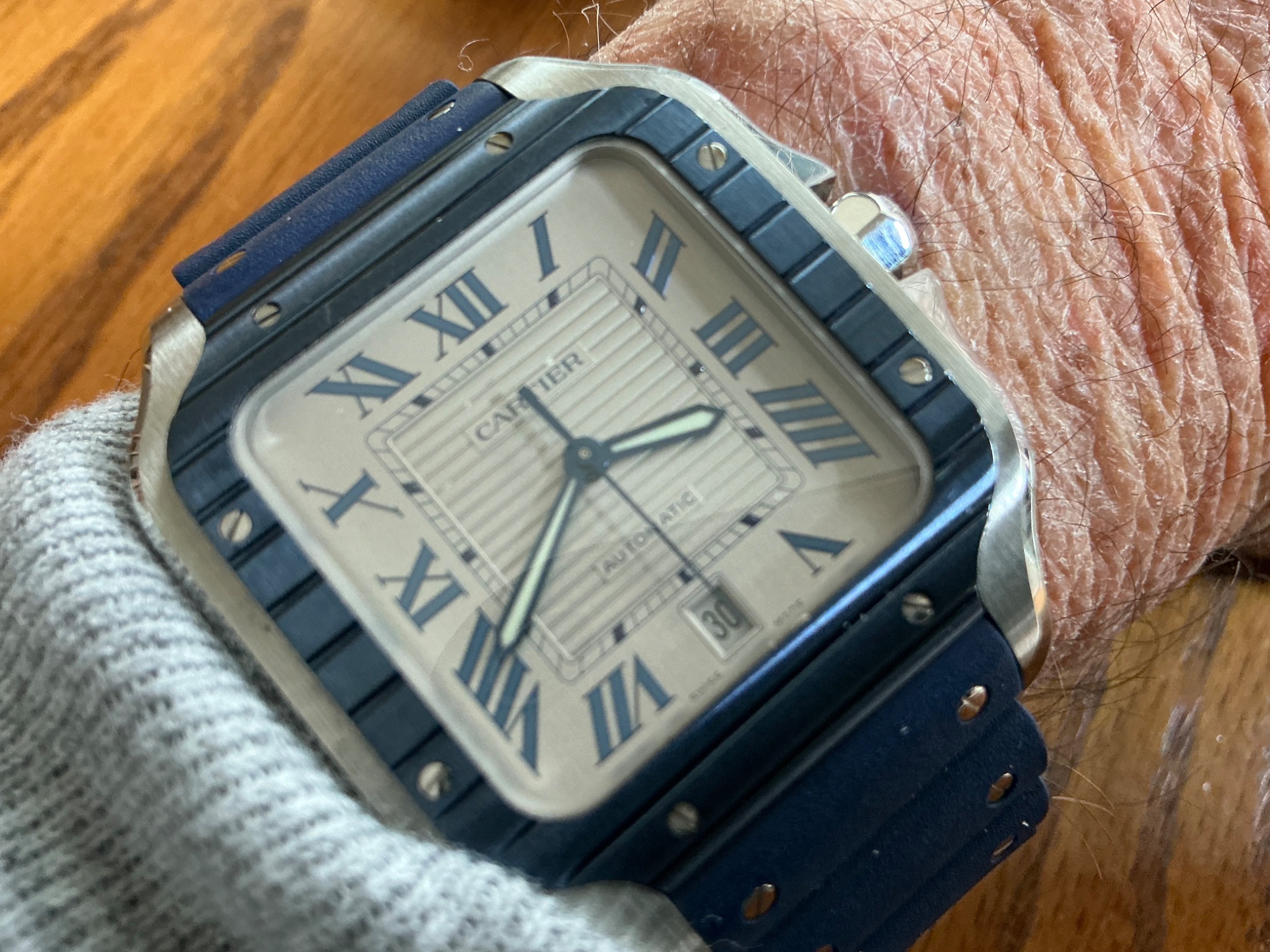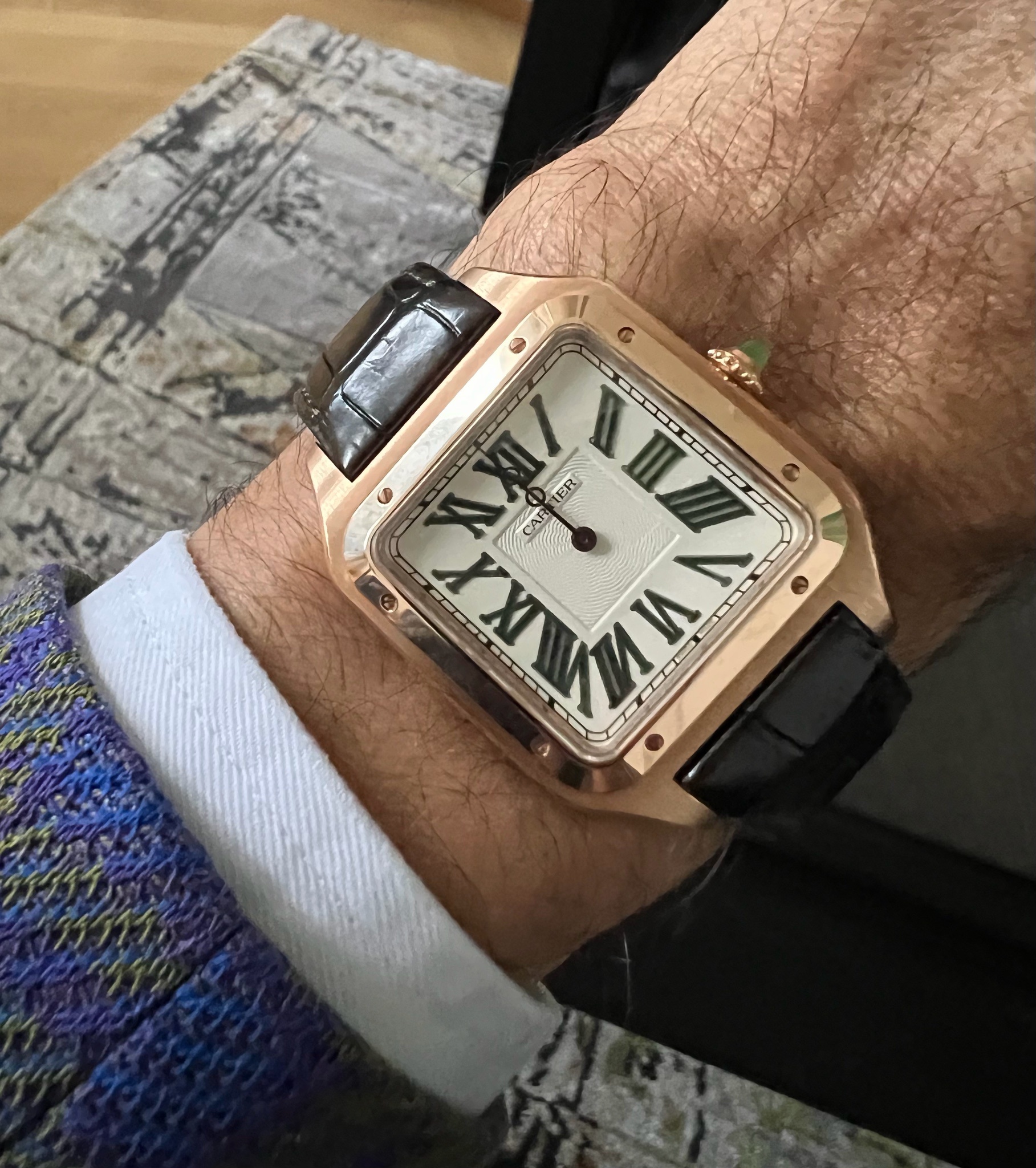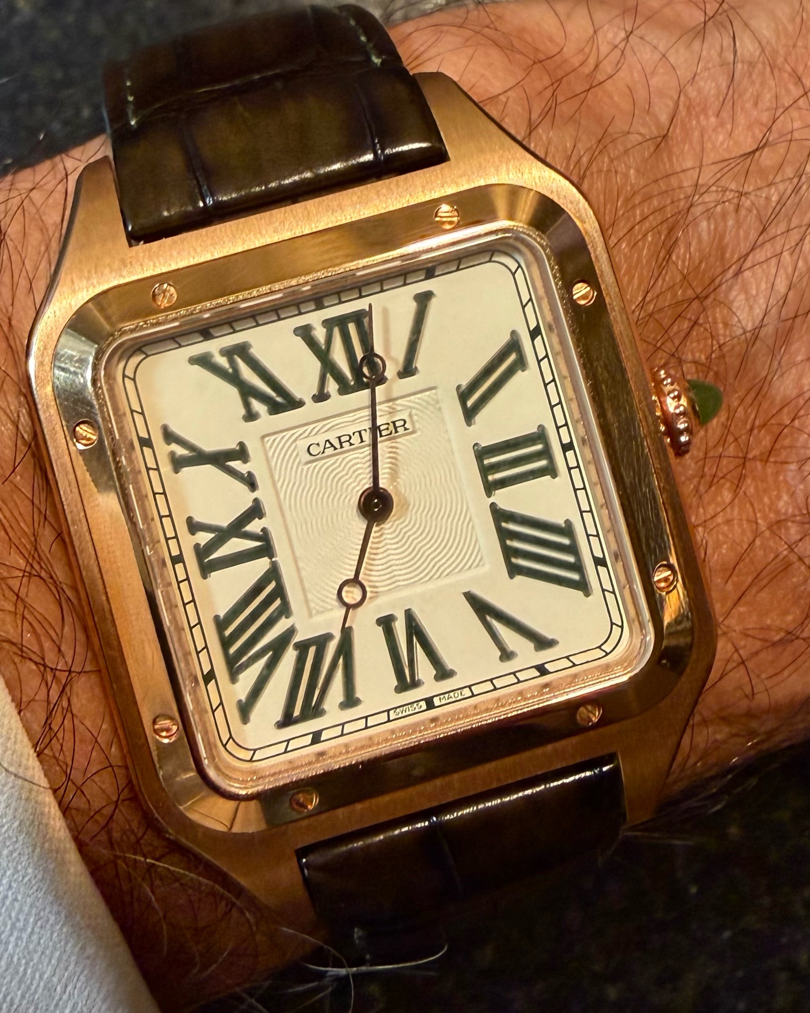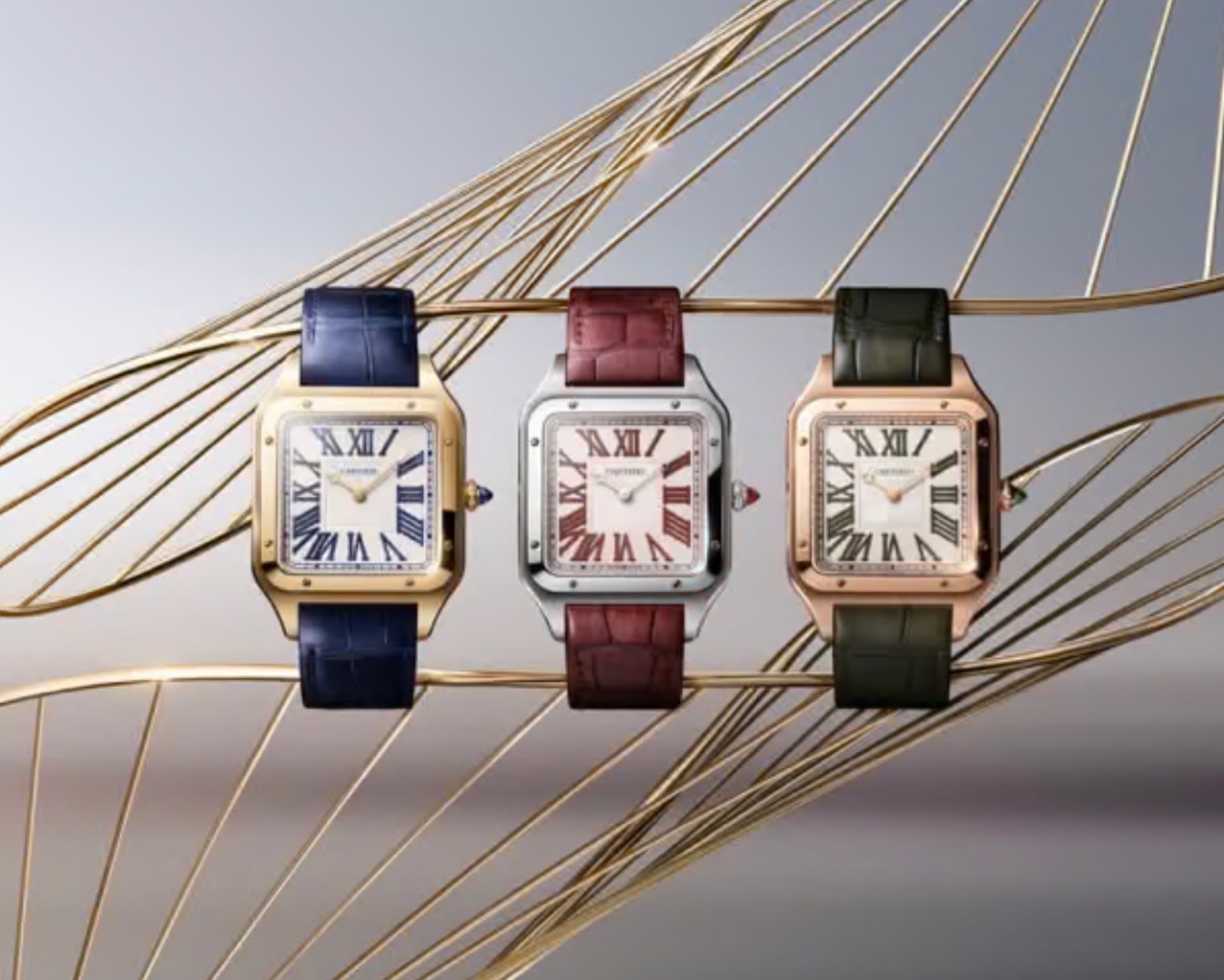 Cartier presented a rather unusual trio within the Santos-Dumont XL line. Three precious metal cases, three stone dials, and three different stone numeral sets.