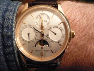 Sellers Comments : I have just received my Master Perpetual back from a complete overhaul at the JLC factory in Le Sentier. This involved tear down and replacement of the moon dial, along with cleaning, polishing, lubrication, new gaskets, caliibration and new crown and new brown alligator strap(lon