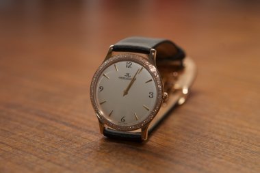 There are three gem set versions of this watch. Her's is red gold (5N18) with two rows of diamonds. On the JLC website, you can see a hint of the watch in the Focus section of the Ultra Thin… It is described as "A feminine interpretation" This is the quick iPhone pic I snapped when the watch case wa