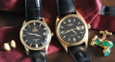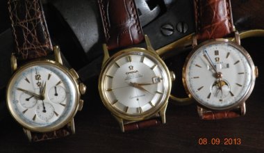 Dear Sirs My latest cacth,- the wonderfull dog-legged Constellation pie-pan in the increasingly rare 18 carat version. Happy days ! Here in the middel of a familie foto with my ref. OJ2439, 14 carat chronograph, cal. 321 and my 14 carat OJ2473 Cosmic moonfase. The Connie is 1966, the chrono 1952 og