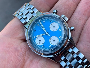 Dear Nicolas, i found a strange dial, its obviously a redone one but has the same round dots as the E2644 furthermore there is still some blue paint on the back. in my opinion this was a real E2644 blue dial thanks for looking Best Gerald