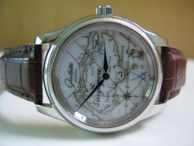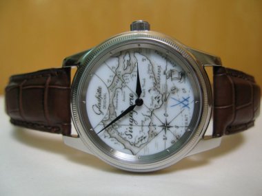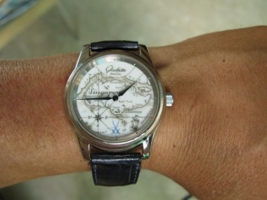 it was made for our 40th birthday. a total of 40 were made in 2005. 2 in platinum, one of it was presented to the president of singapore. 10 in rose gold and 28 ss. it was an old map of singapore with the help of someone from the watch industrial from singapore. hope i am not too wrong. please corre