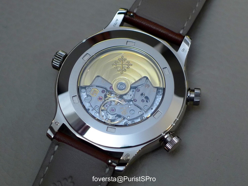 The Calatrava Pilot Travel Time  is equipped with the 324 SC FUS movement visible through a transparent caseback. The module being located on the dial side, the offered view is similar to that of a 3 hands watch using the same basic movement. The finish is clean, clear and without any useless style. I would have liked to find a solid caseback or an officer caseback opening in the vertical direction because of the pushers to bring an additional consistency taking into account the atmosphere of this watch. The movement's performance is very classic due to its 324 base and has a 4hz frequency for a power reserve between 35 and 45 hours. I am always  very surprised by this way of presenting the power reserve by Patek Philippe but anyway, in a contemporary context, whatever is its actual duration, it remains relatively short despite the excellent winding efficiency and reliability.