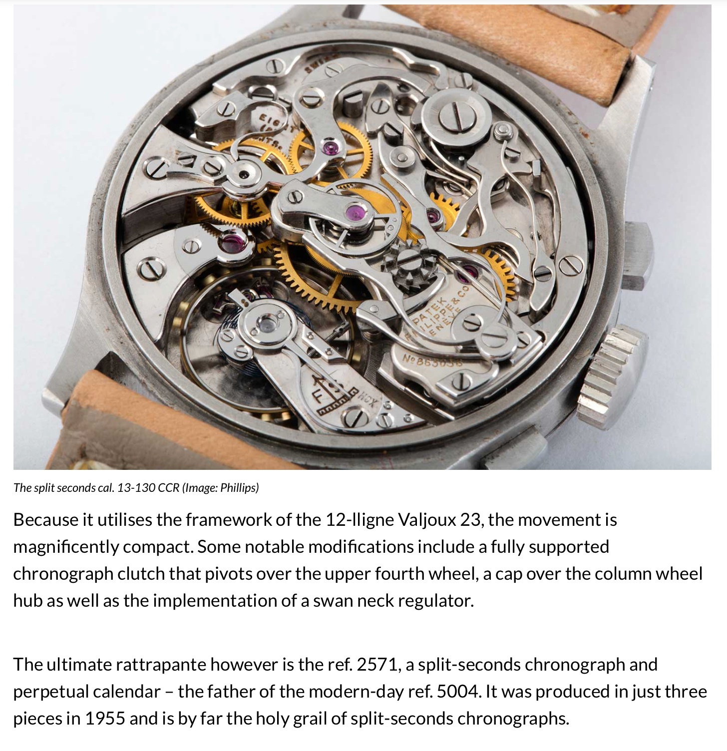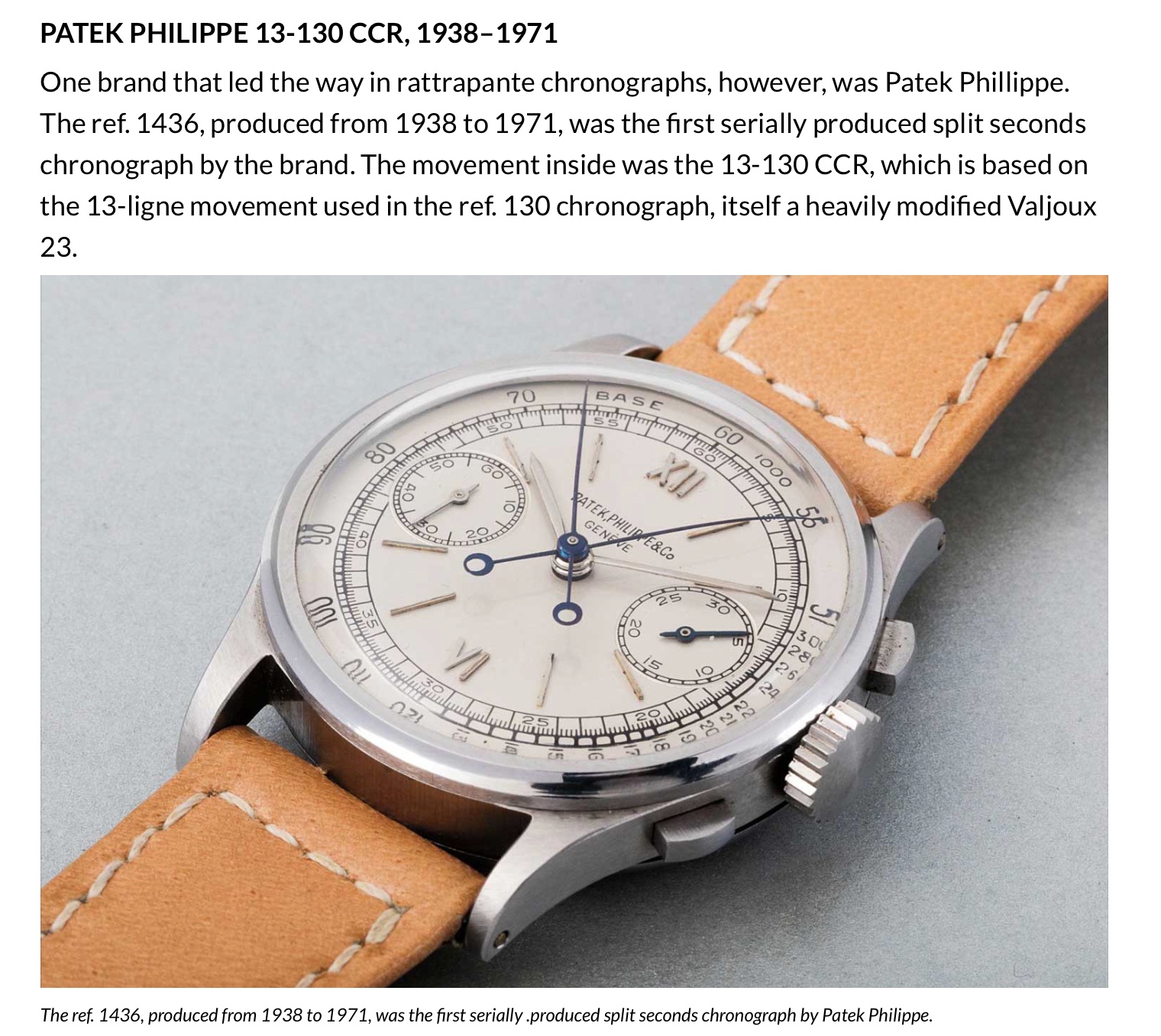 Only 140 examples of the Patek Philippe ref. 1436 were ever made in the approximately 33 year production period from 1938 until it was discontinued in 1971 . This Split-Seconds Chronograph is as simple and pure aesthetically as it is complex technically: ...
