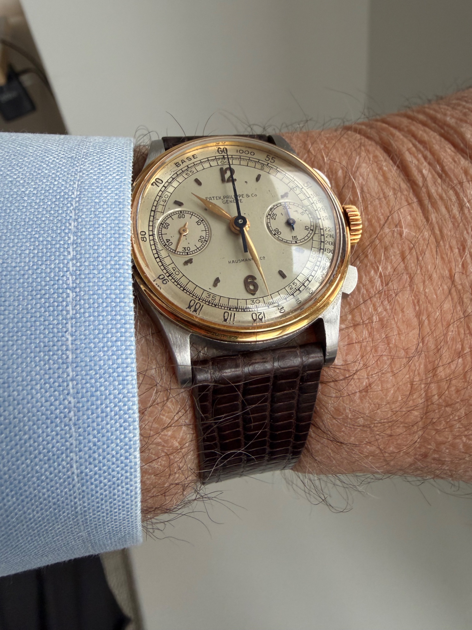 this two-tone Hausmann signed ref. 130 is quite something. As for your question, I’d personally hunt for an authentic period correct PP steel pin buckle, as I think it was missing when MLG sold it last June. And I would choose a brownish leather strap (wh...