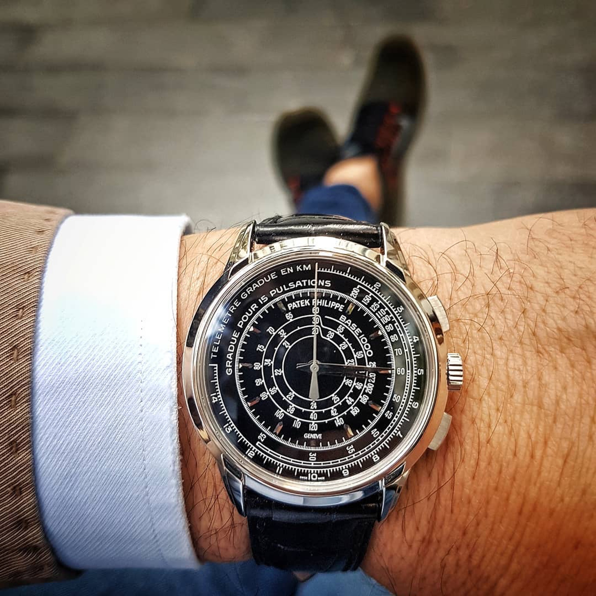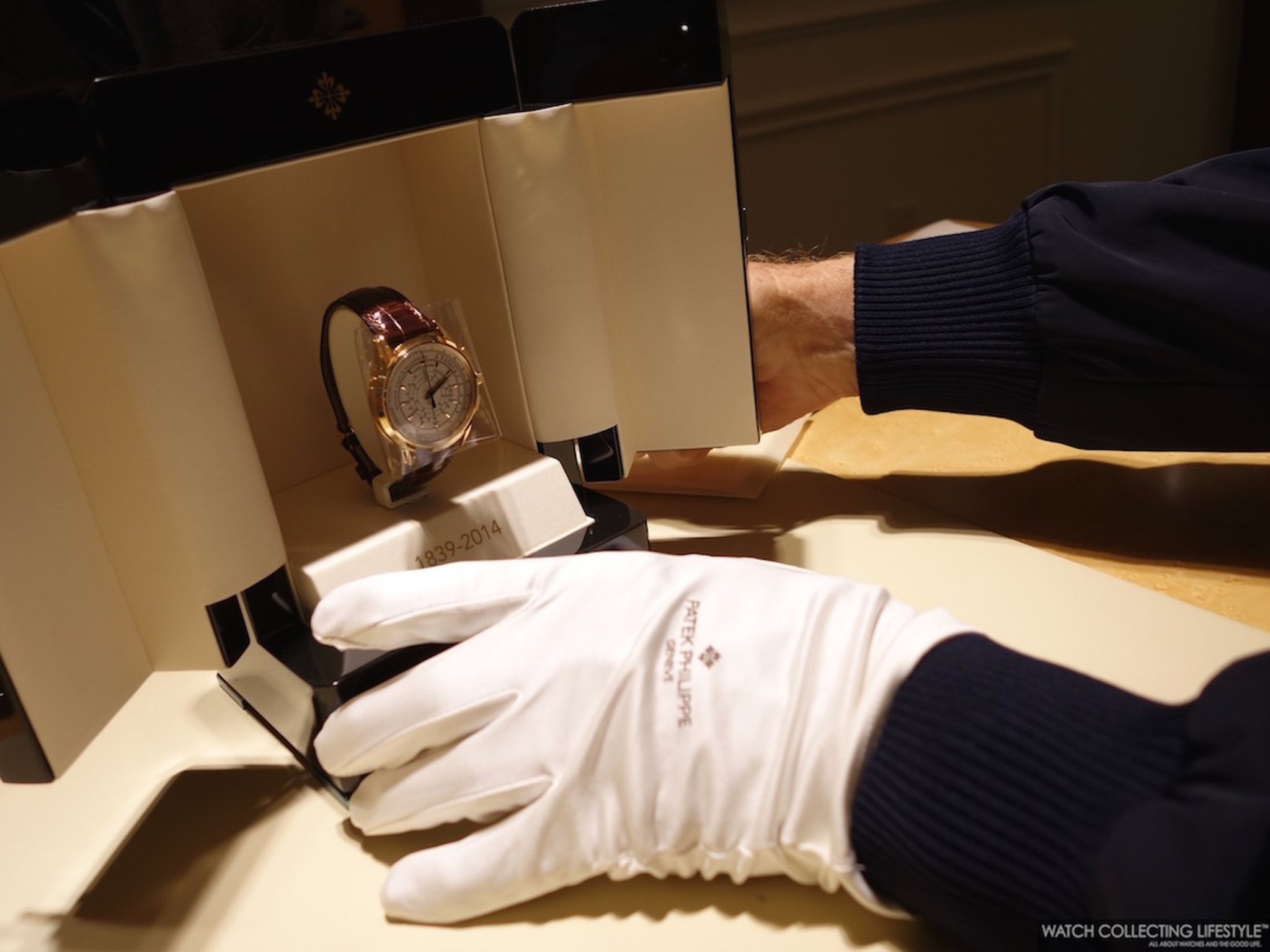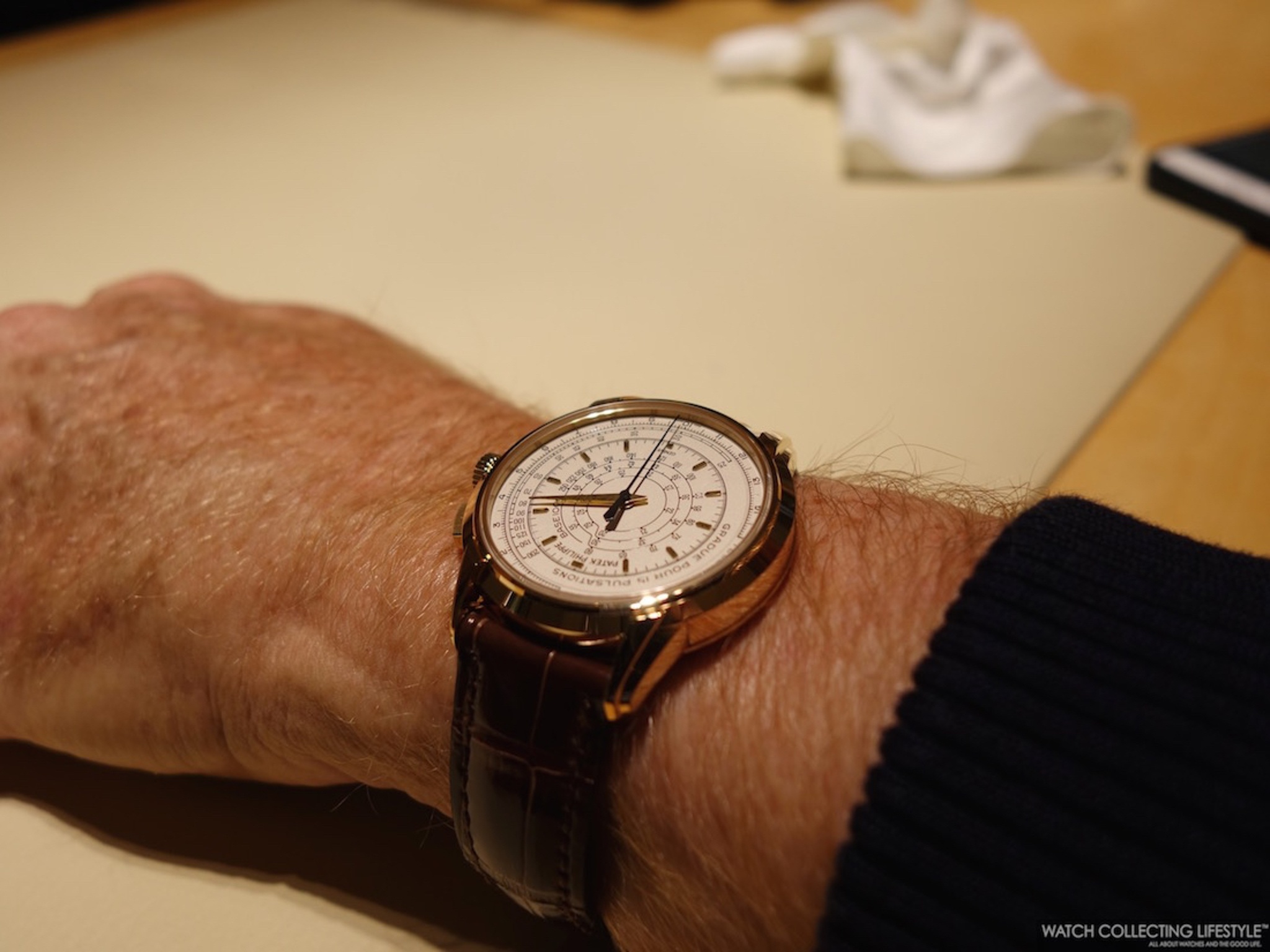 During my recent stay in Geneva, I was able to try on the Patek Philippe Triple Scale Flyback Chronograph ref. 5975 in its white gold version.