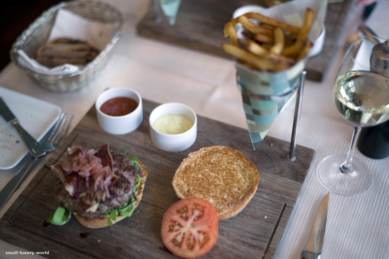 a burger with dry aged beef, patanegra bacon … belgium fries … German Riesling …