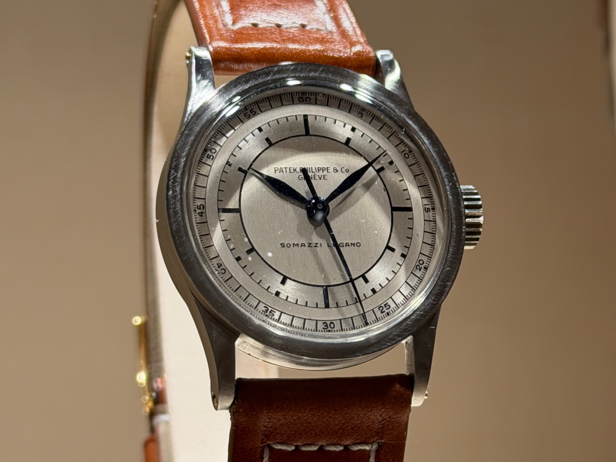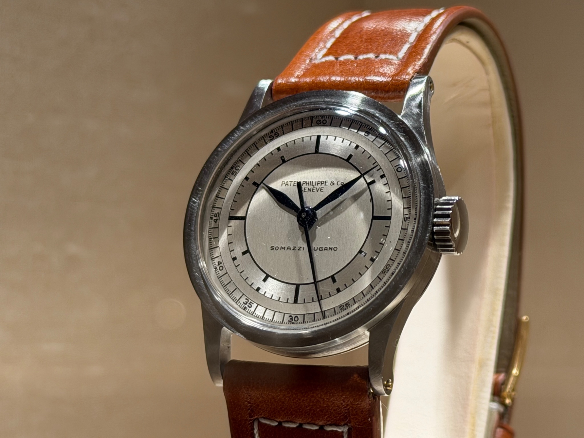 In showcase 64 of the Patek Philippe Museum, entitled "The Second at the Center", sits this magnificent watch with a two-tone sector dial signed “Somazzi Lugano”.