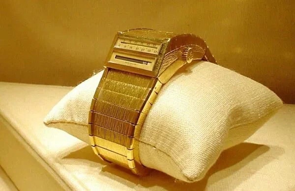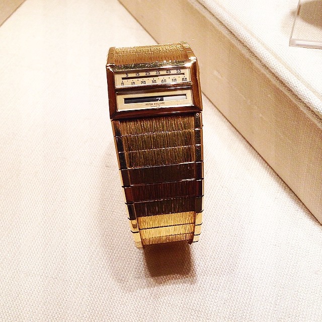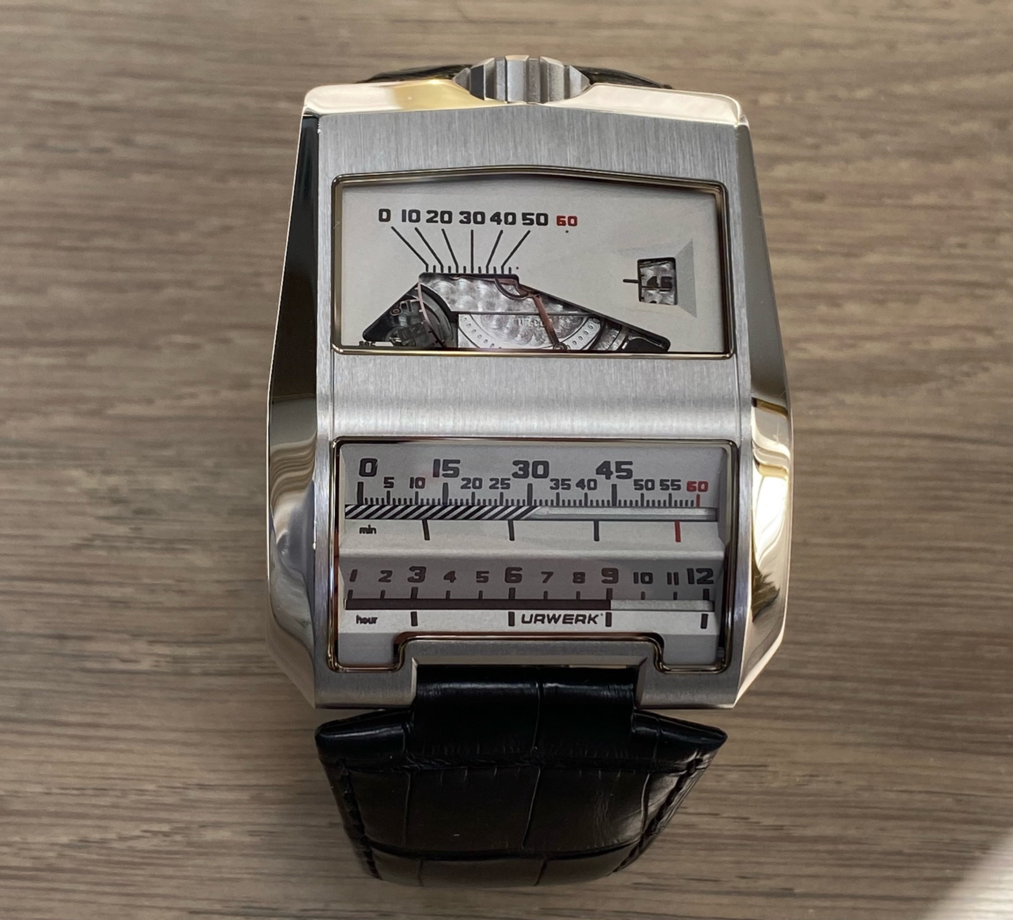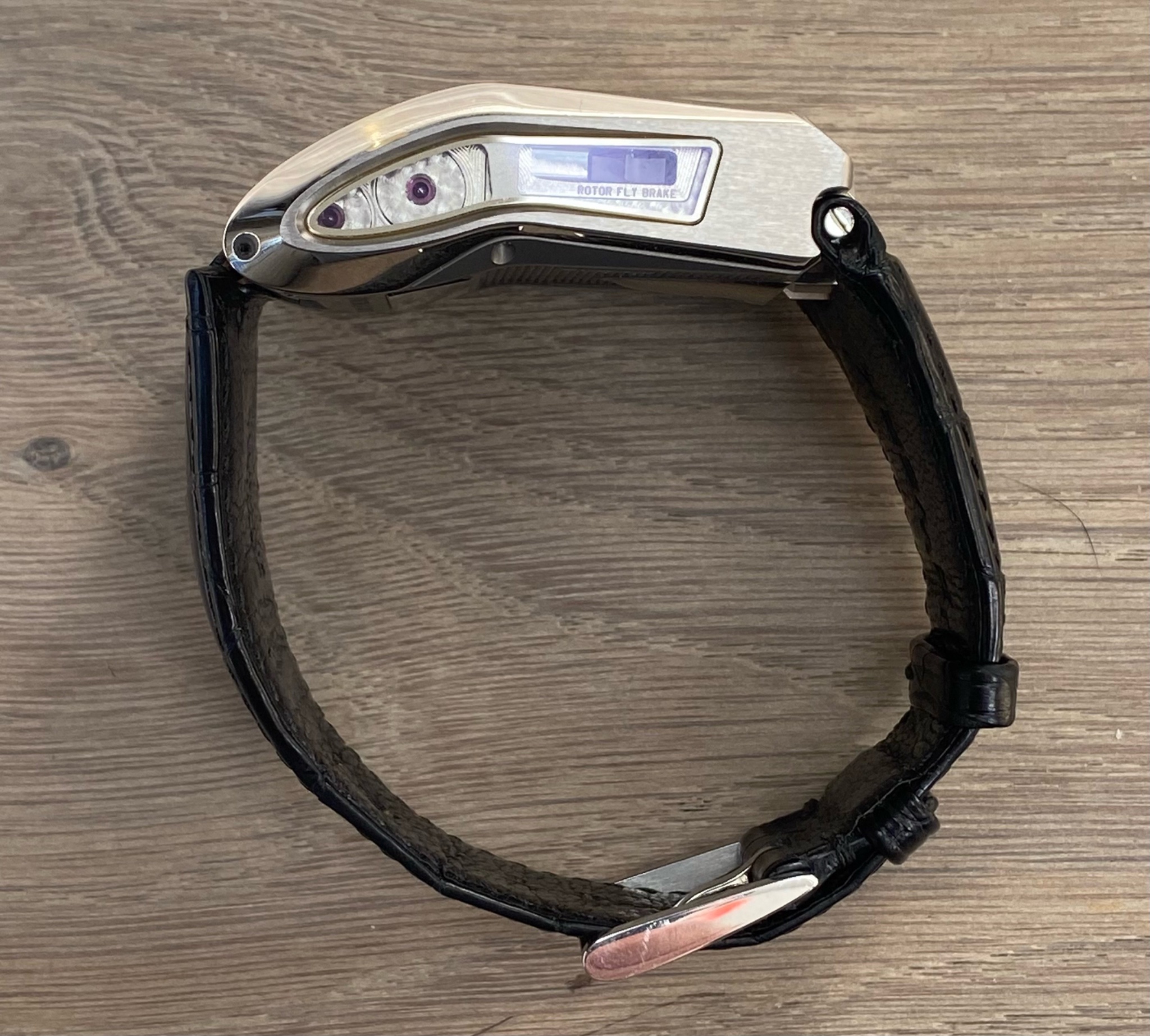This wristwatch, with its dual linear display of hours (at the bottom) and minutes (at the top), wad designed by legendary designer Gilbert Albert.