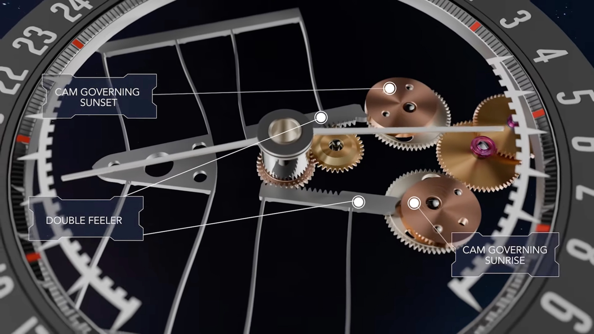 Indeed, the date numerals also serve as hour markers for the sunrise scale (from 5 to 11) and sunset scale (from 17 to 23) and the offset position of the “1” allows for a perfect symmetry.