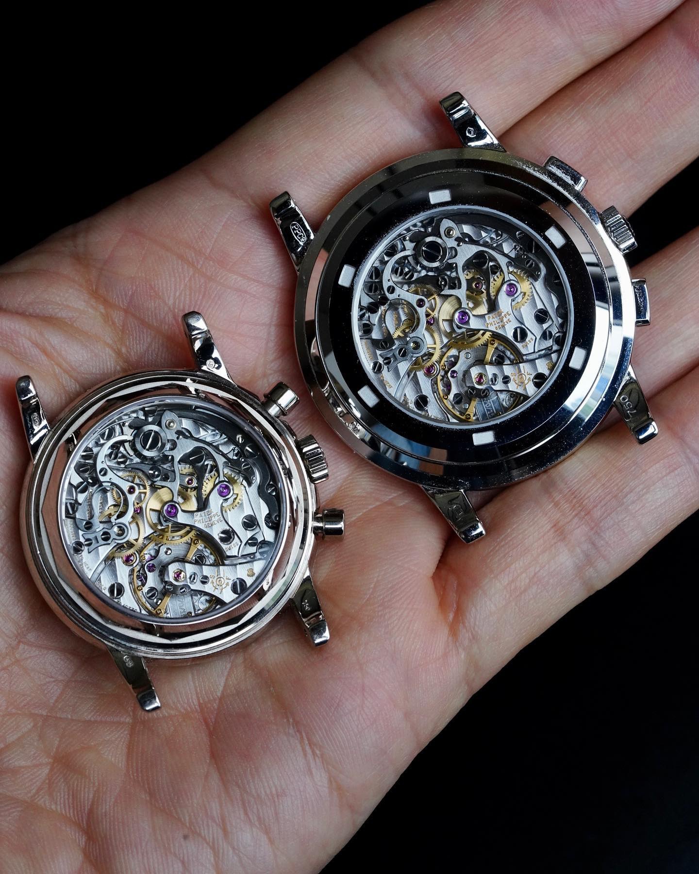Although both feature a white gold case, a silver dial, and a chronograph movement based on the legendary Lemania 2310, these two Patek Philippe watches are very different: