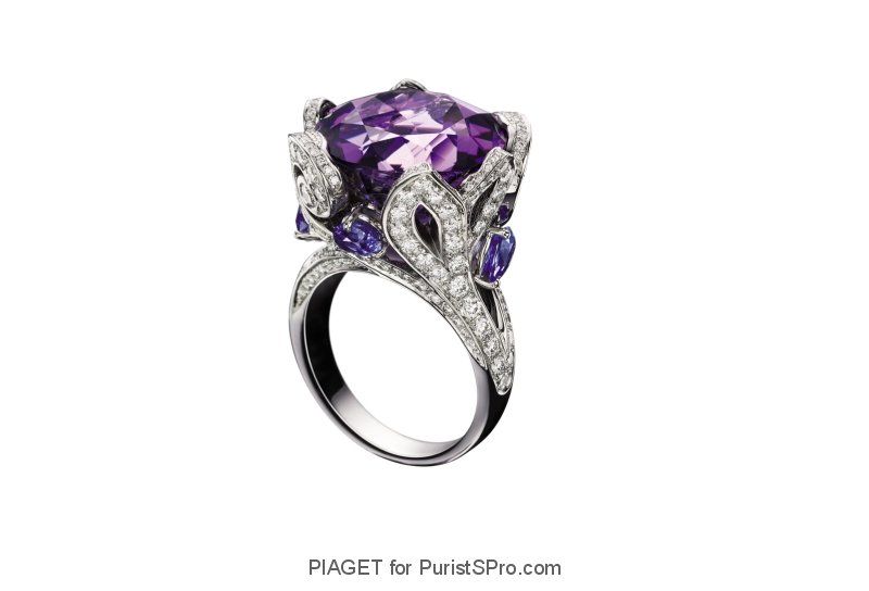 Piaget also offers fine jewelry from its Limelight collection to further accessorize every outfit. Like their Limelight watches, the Limelight jewelry pieces are all very elegant and showcase gem-setting expertise in a plethora of organically inspired shapes. One thing I enjoy very much about the Limelight jewelry pieces is that they have a lot of movement to them -- the flowing shapes, and delicately hanging teardrops of diamond or sapphire capture the light exquisitely. My personal favorite of the jewels pictured below is the amethyst cocktail ring. Doesn't it look like the 13.5 carat amethyst is blossoming up from its setting? Lovely.