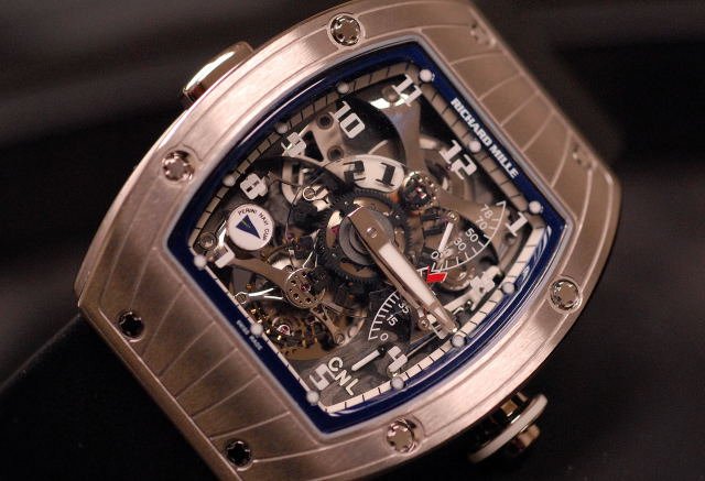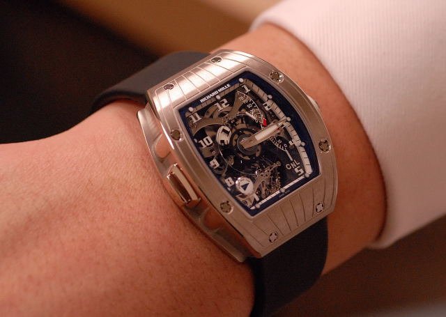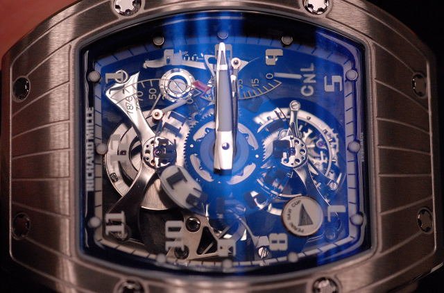 Without any more blah, blah from yours truly, some pictures of the newest RM to sail the waves. Note how the reconfiguration of the torque indicator to a more efficient location on the RM014 has paid dividends in allowing the GMT indicator function to be reallocated to a more logical position (in my mind).For your viewing pleasure: the first shots of the RM015: