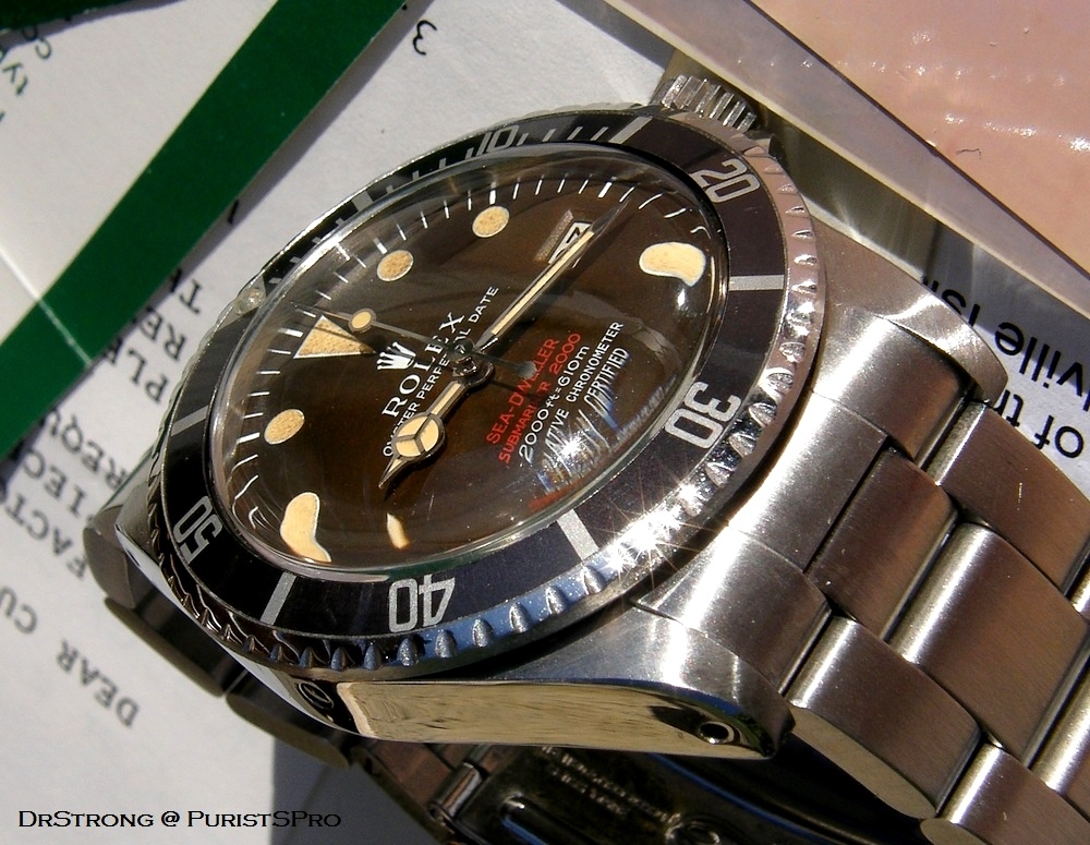 There was an old Rolex booklet saying "Every Rolex Tells a Story"â?¦.I should ad that "Some Have Amazing Stories to Tell" ! I have already described here the variations of the early â??thin caseâ?? Sea Dweller, a fascinating watch that can be considered as a prototype of the â??regular productionâ?? Sea Dweller ref. 1665: I am very proud to go now in public with my latest catch: an example of this model that comes from the original owner, a Canadian diver who wore this watch when working on his extreme project for forty years and has founded a very famous diving comapny. For someone like me â?? who loves the Rolex toolwatches that have been used for their original purpose â?? it is quite a thrill to own a first owner watch like that with such an history and such a complete documentation ! The watch comes with a provenance letter from the diver, several Rolex service documents with accompanying letters and some pictures of the diver wearing the watch when working all over the world. The watch itself is a collectorâ??s dream, in a very good - all original â?? condition. The dial has turned to a spectacular brown color: together with the red writing and the yellow patina of the indexes, I find this combo visually breathtaking ! The thin case makes the watch very pleasant to wear and the typical thick caseback engraving is always a pleasure to look at: The case is still in top condition and having on this watch a bezel insert with such a brownish patina is just a miracle ! The superdome "tropic 39" plexi definitely rules ! This is a very rare and interesting watchâ?¦..but the icing on the cake is the story that comes with it ! Letâ??s the original owner tell it: â??I purchased the watch in 1972 from Monte Cristo Jewellers of Vancouver, because I was going to a diving job in Offshore Newfoundland and my regular watch was not certified for the depth of the intended dive. The job was to perform a â??Hot Tapâ?? on a subsea blow-out preventer that was pulled over when the drill rig was forced off location by an iceberg.â?? â??Since 1972 the watch has been with me on several salvage jobs from one extreme location to another; of note, the re-floatation of the cruise ship Pegasus in Venice Italy and the recovery of a major plane crash offshore of Melville island in the Canadian arctic.â?? â??The watch has also been with me in Iran working on a submarine oil pipelines and in Cuba, while looking for sunken Spanish Galleons for the ministry of Armed Forces.â?? â??I have travelled all over the world with my watch and worked on countless projects, some routine and some extremely dangerous. Some of the projects were pioneer and/or pilot projects and have received media attention.â??