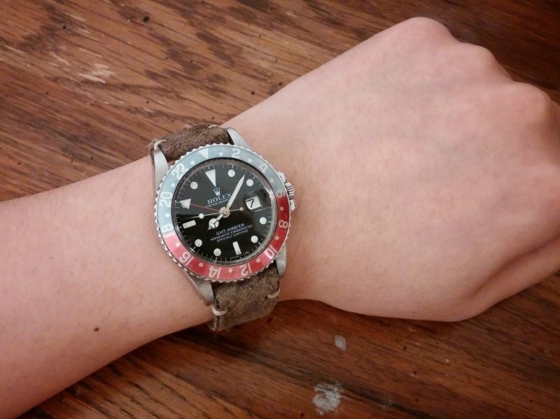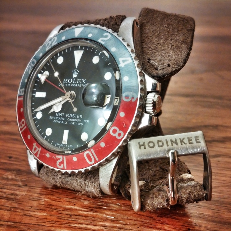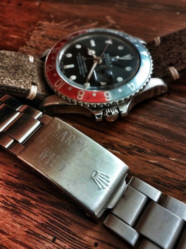 Love the faded bezel on this one. Currently paired with a distressed grey dial also from Hodinkee. Original bracelet engraved "Larry Wild"... I kind of like it!