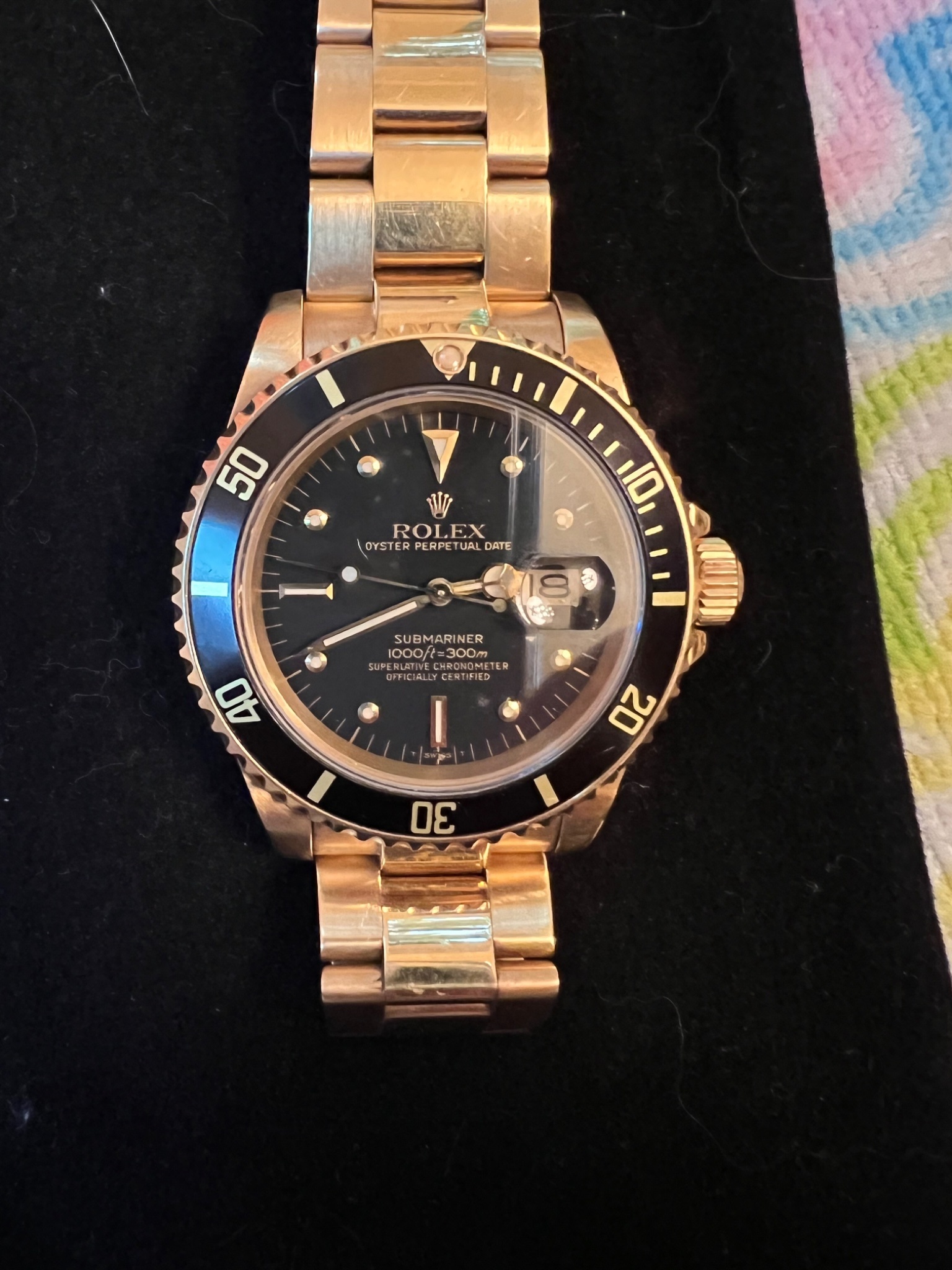 To me more interesting than the black dial and bezel. Beautiful. By the way, my Sub is a transitional model, so the crystal is sapphire with quickset date.