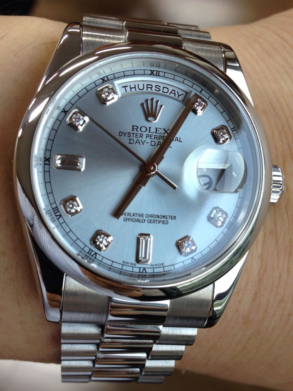 This rolex with very beautiful dial .. The diamonds cut and colour are the best ... Truely a president watch.... The date window and day display add to Watch craft...