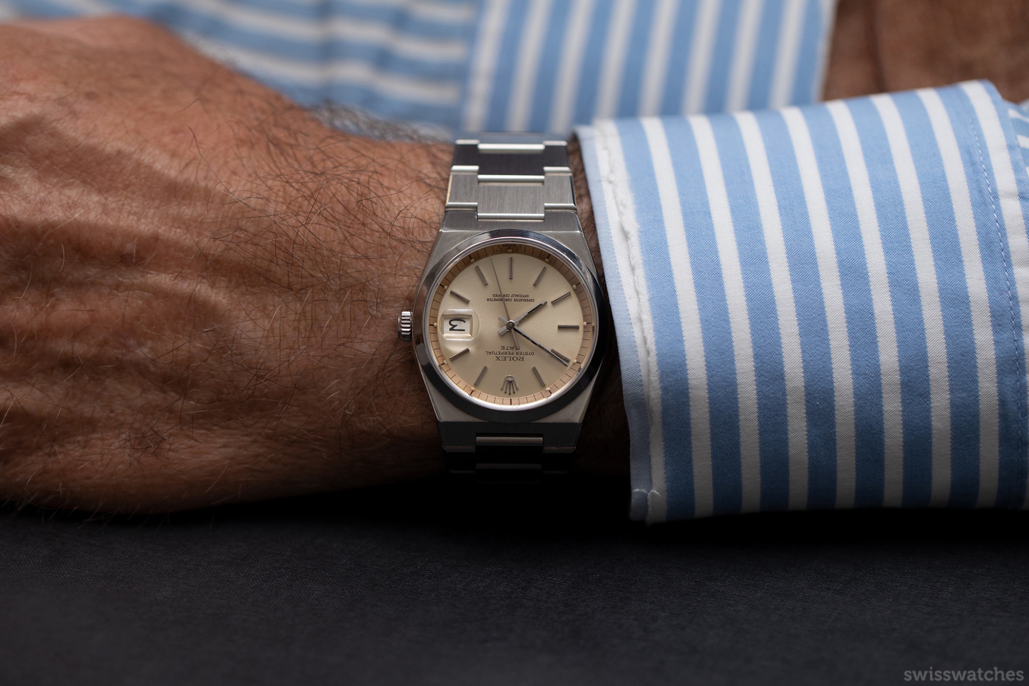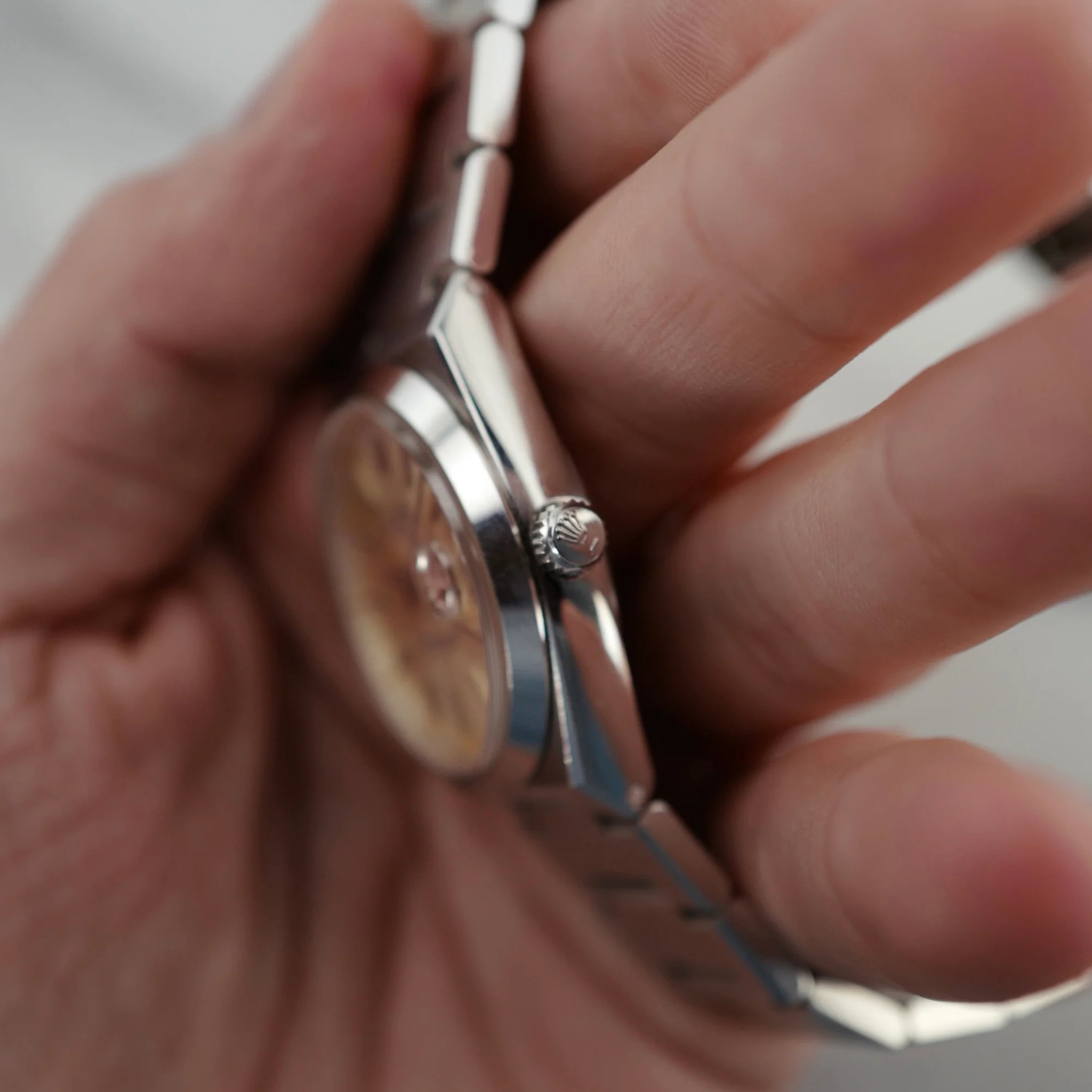 The angular, integrated bracelet steel case of the Rolex ref. 1530 was originally designed for the Oysterquartz. In 1975, before introducing the Oysterquartz, Rolex produced a limited number of ref. 1530, housing the chronometer-certified, caliber 1570. This model was discontinued shortly-after, in 1977, upon introduction of Rolex's quartz calibre. It’s estimated that less than 1,500 examples of the ref. 1530 were produced.