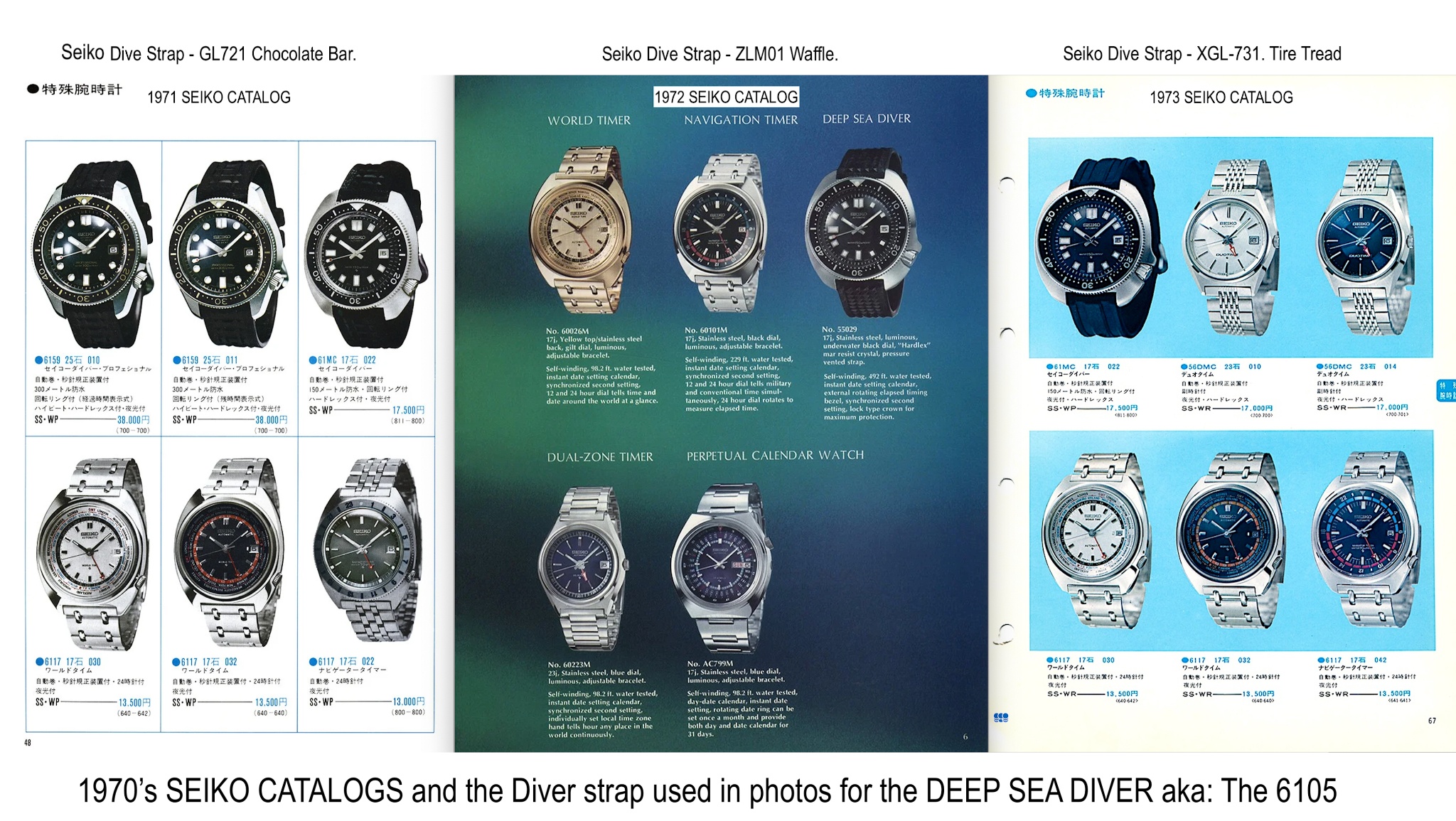 1970's SEIKO Catalog and photos of the DEEP SEA DIVER aka 6105 and the diver straps Seiko paired them with in their photo shoot ...