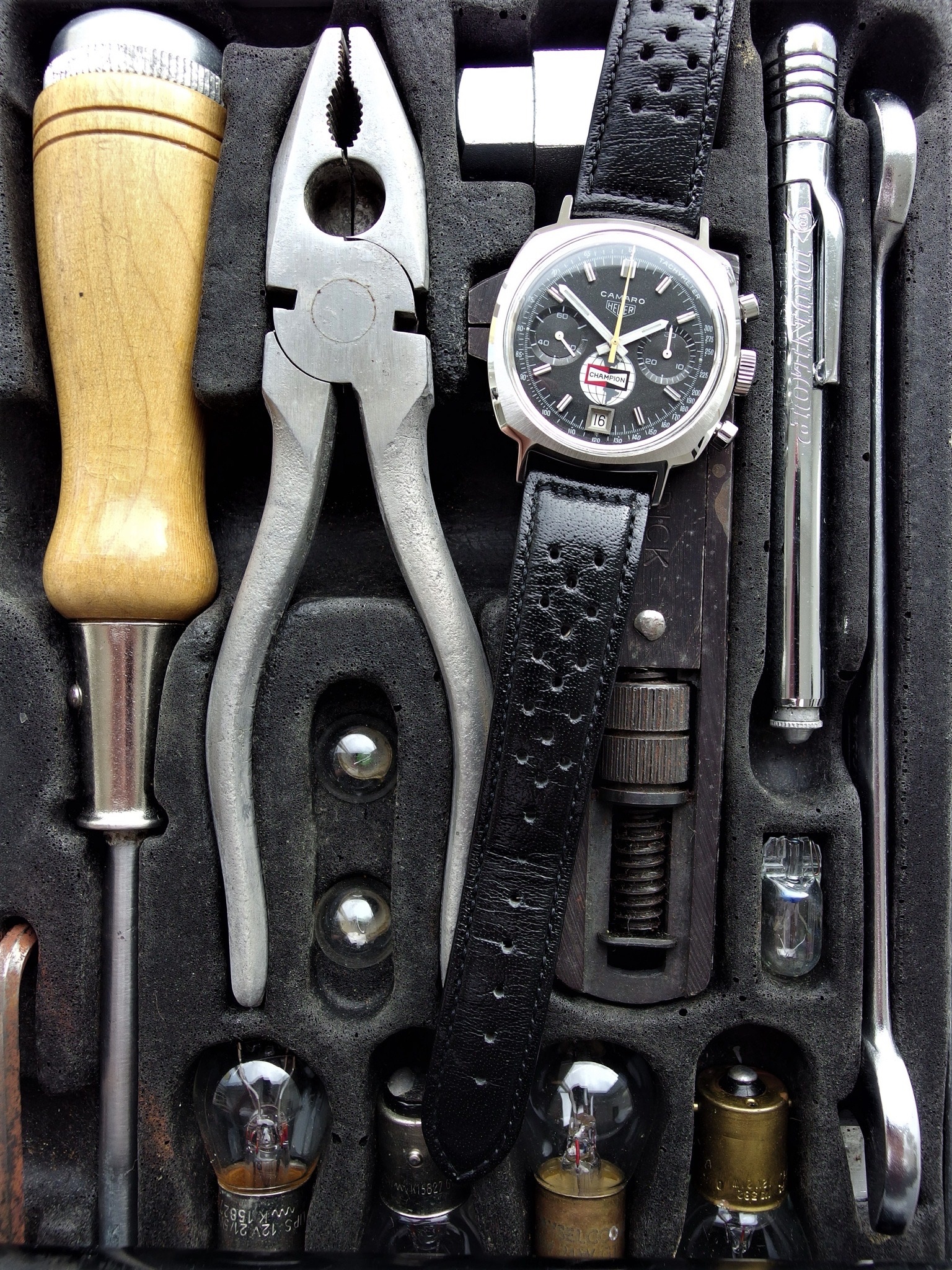 Some new pictures of my 1970 Heuer Camaro "Champion" ref. 73443 on a Bentley T-type (1971) car tool kit (+ some more pics)