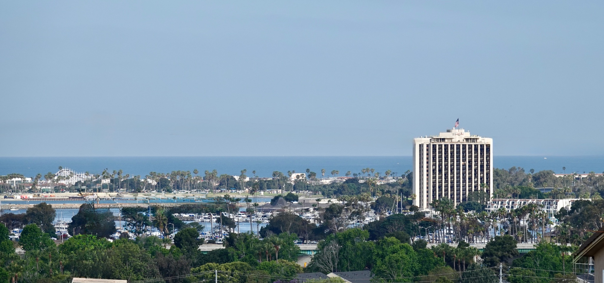 Farther out, Mission Bay roller coaster, hotel and the Pacific Ocean.