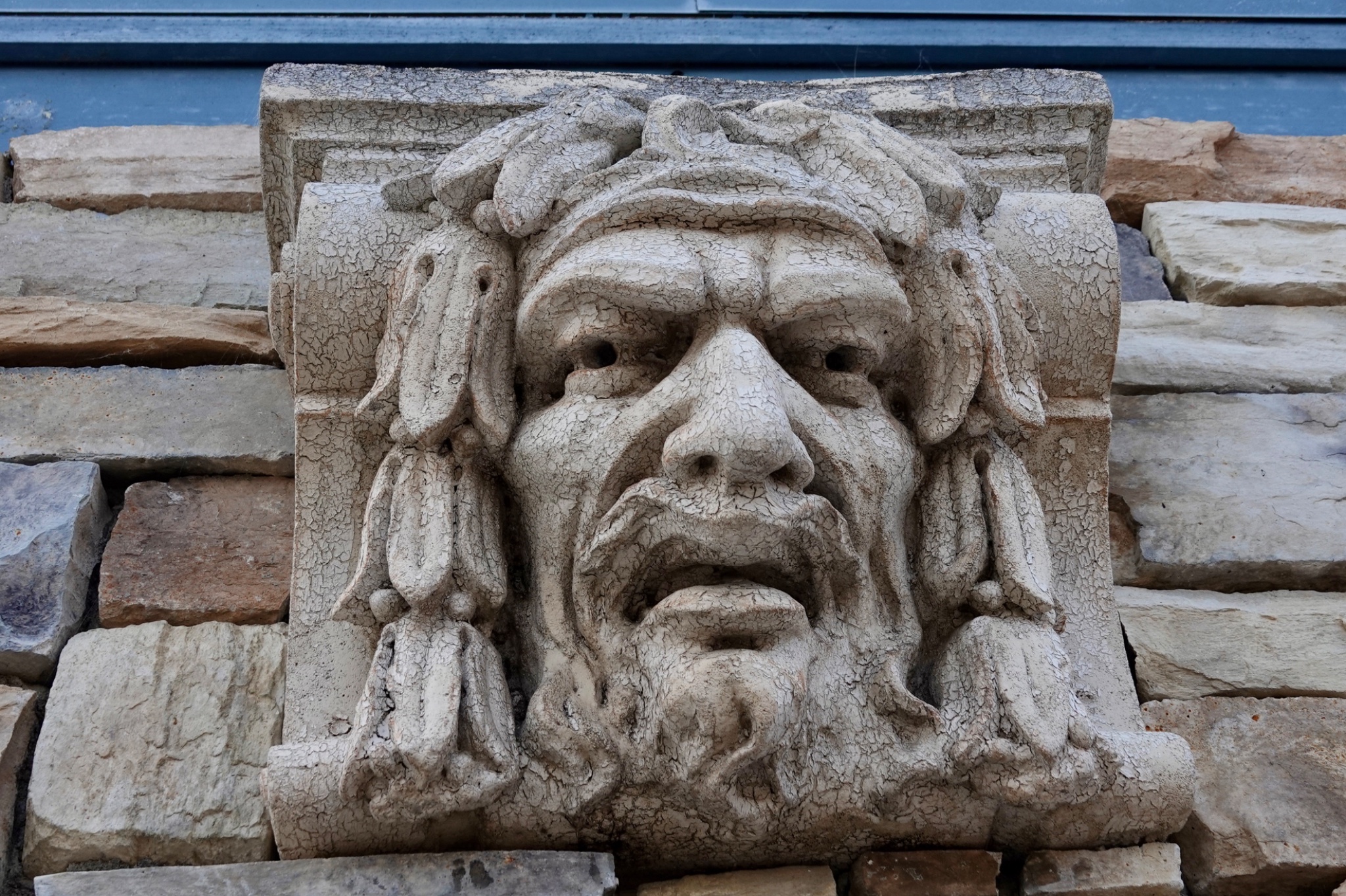 Stone Man scowls down at us from his perch over the garage.