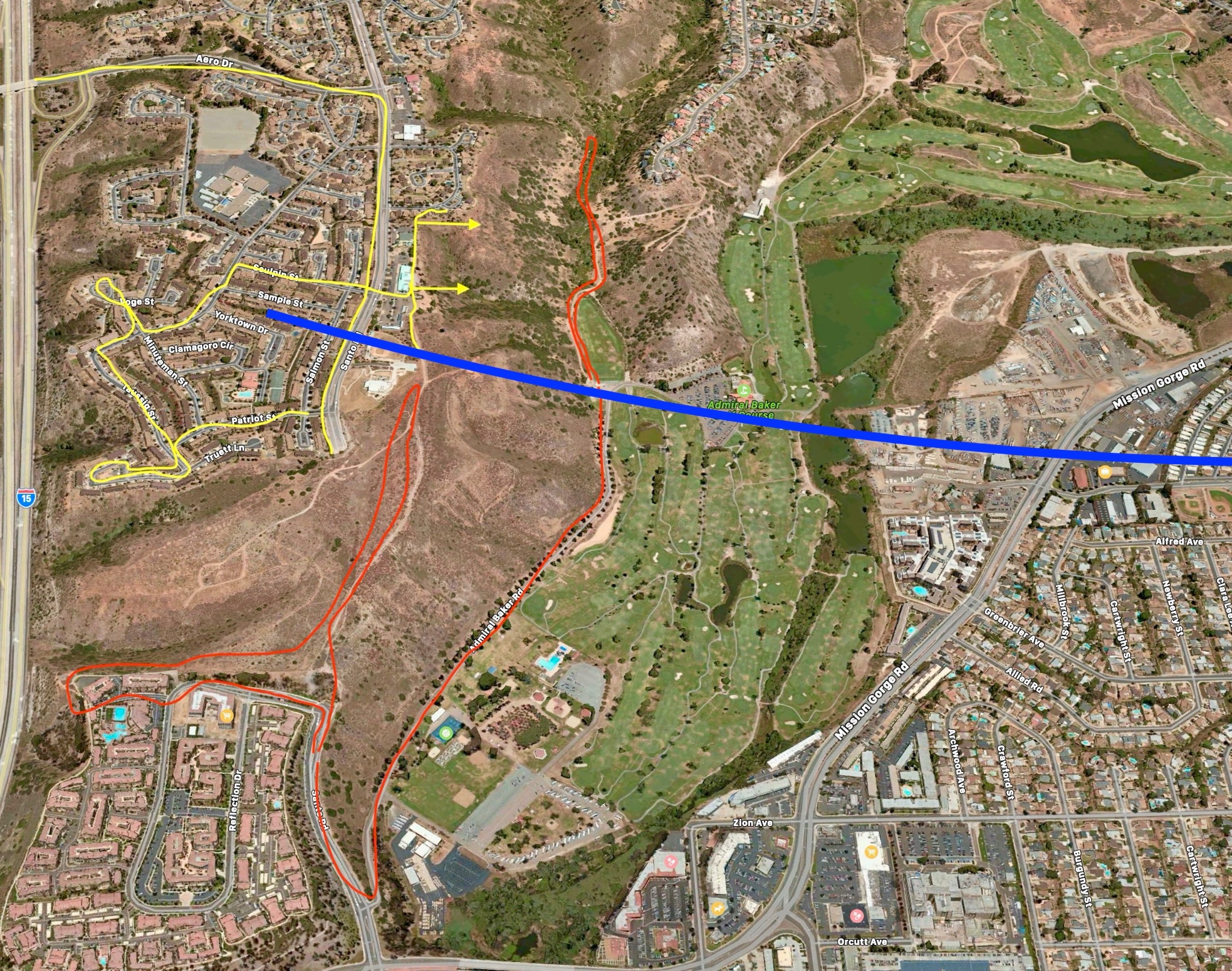 A favorite walking path of ours, in the red. Aircraft trajectory in blue.