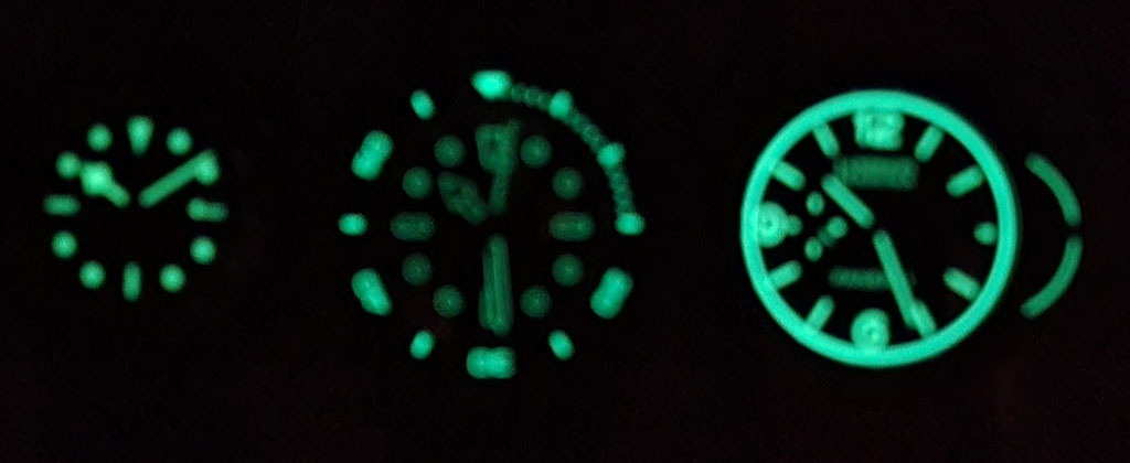 Under active backlight, the circa 2021 Panerai 1888 with the X1 lume very much shows that the just-released Bell&Ross with new X2 lume is very good, but in this color / type falls a bit behind the Panerai’s X1. On the other hand, the X2 lume looks much, much crisper, with sharper lines and more ‘brightness control’.