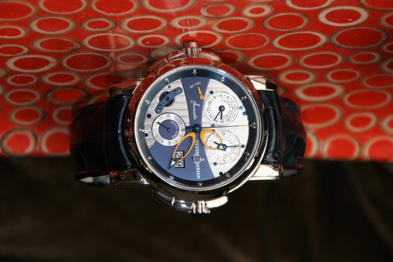 ... not a lot like the watch photographed on the back cover on many watch magazines. I was expecting to see the triangular subdials for the countdown and alarm dials, a modernized cote de Geneva pattern in the lower half of the main dial and the Ulysse Nardin name to ride above the date on the right side of the dial. I really like the watch used in marketing materials, and I, too, am disappointed by how the current dial deviated from both the advertisement and the original. As an owner of the original I thought the Sonata should have remained in a classic case and not in a sportier case. However, I did like the advertisement watch and felt the transition to the sportier case/design was well done. The watch you presented fell short on this account and you summed up the appearance quite well.