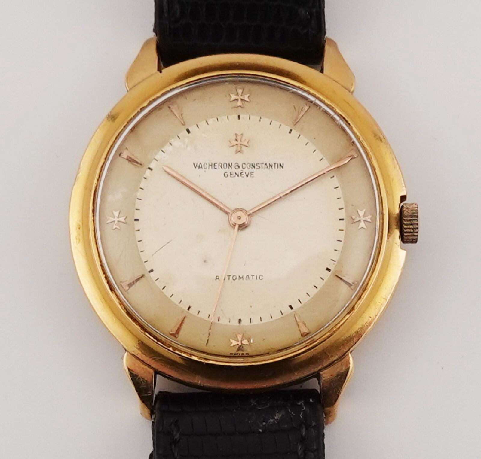 At an auction recently I saw this nice VC, and was about to bid, until I had a mixed feeling popping up. The crown is not original which can be easily spotted, but the dial particularly caught my attention: I had never seen before "Malta Cross" indexes at 3, 6, 9 & 12, also because the size of the cross matches exactly the logo.