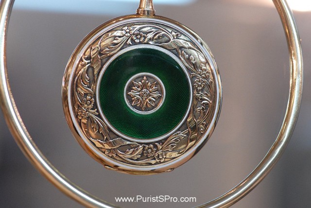 1906 - Pocket watch "Lepine" type, 18k yellow gold, surround and centre of caseback chiseled with a floral motif separated by a green enameled ring on guilloche decor. Bezel circled by thin white enamel. Silvered dial with central guilloche zone. "Breguett" type hands in gold