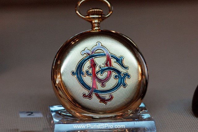 1910 - Pocket watch in 18k yellow gold, engraved and enameled monogram on guilloche caseback. Enamel dial. "Pear" type hands