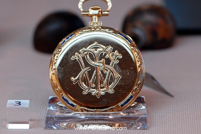 1920 - Pocket watch in 18k yellow gold, decor chiseled in applique on bezel topped by 32 caliberd sapphires, case back engraved with a monogram. Gold dial with engraved decoration between the centre and 12 o'clock. "Cathedral" type hands