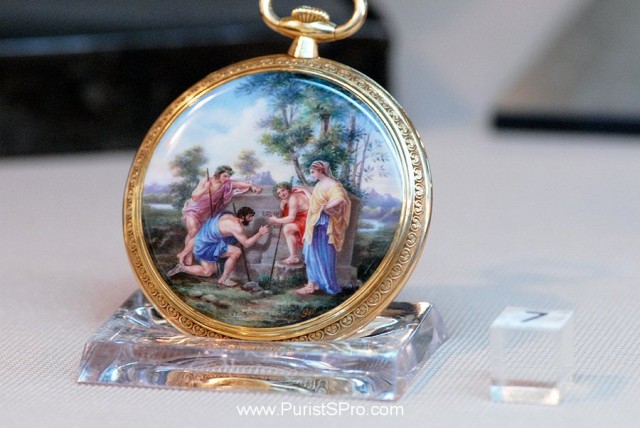 1923 - Pocket watch, decorated bezel, enamel painting on the caseback representing "Les Berges d'Arcadie" after a painting by Nicolas Poussin, double back cover engraved representing a pastoral symphony scene. Engine-turned movement, barrel-bar engraved with two angels. Enamel dial