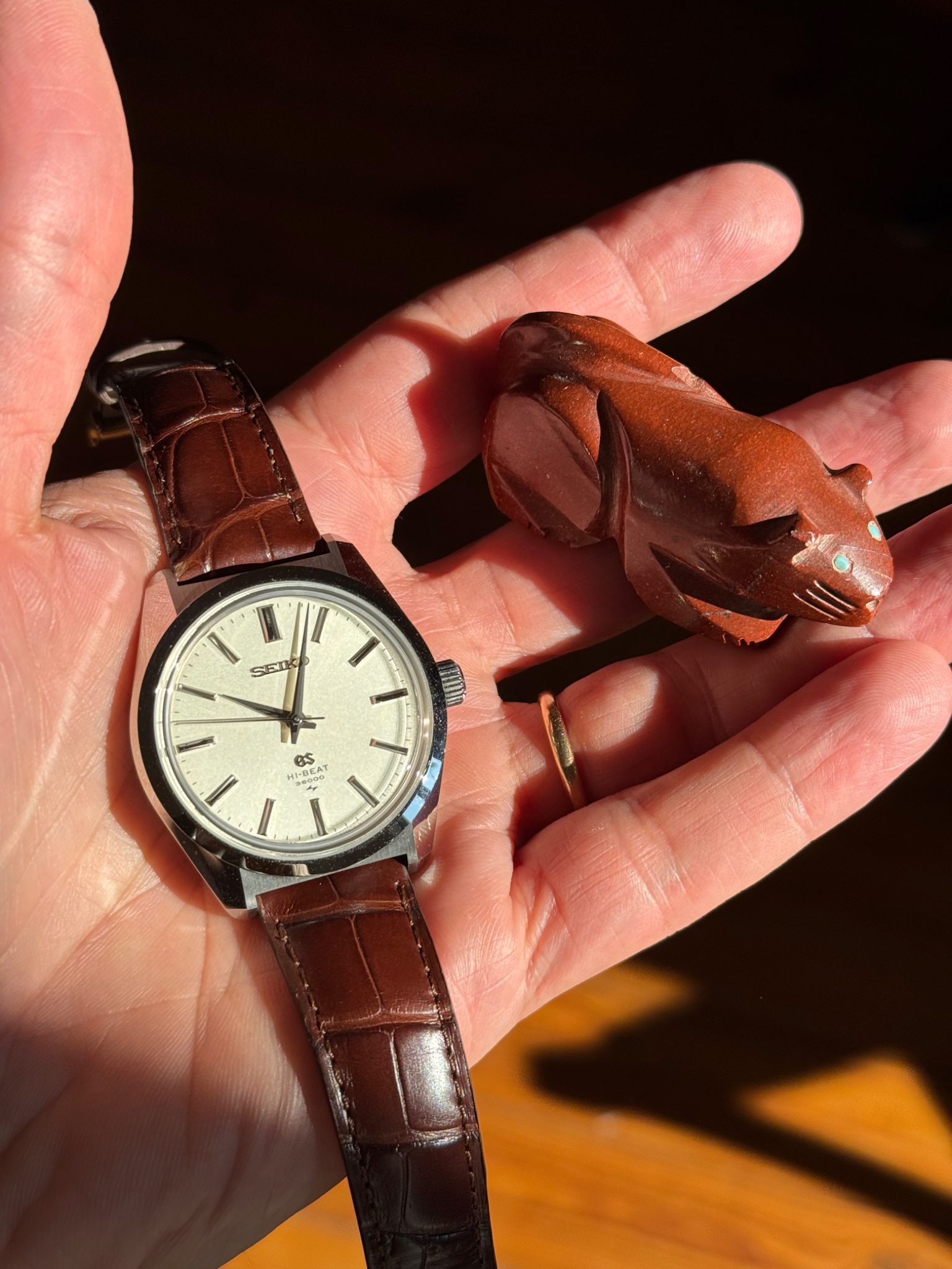 And the Grand Seiko SLGW005, here with one of my Zuni fetishes. I love the angular “Grammar of design” case, the late 60s vibe and the movement with the wagtail bird-shaped spring click.